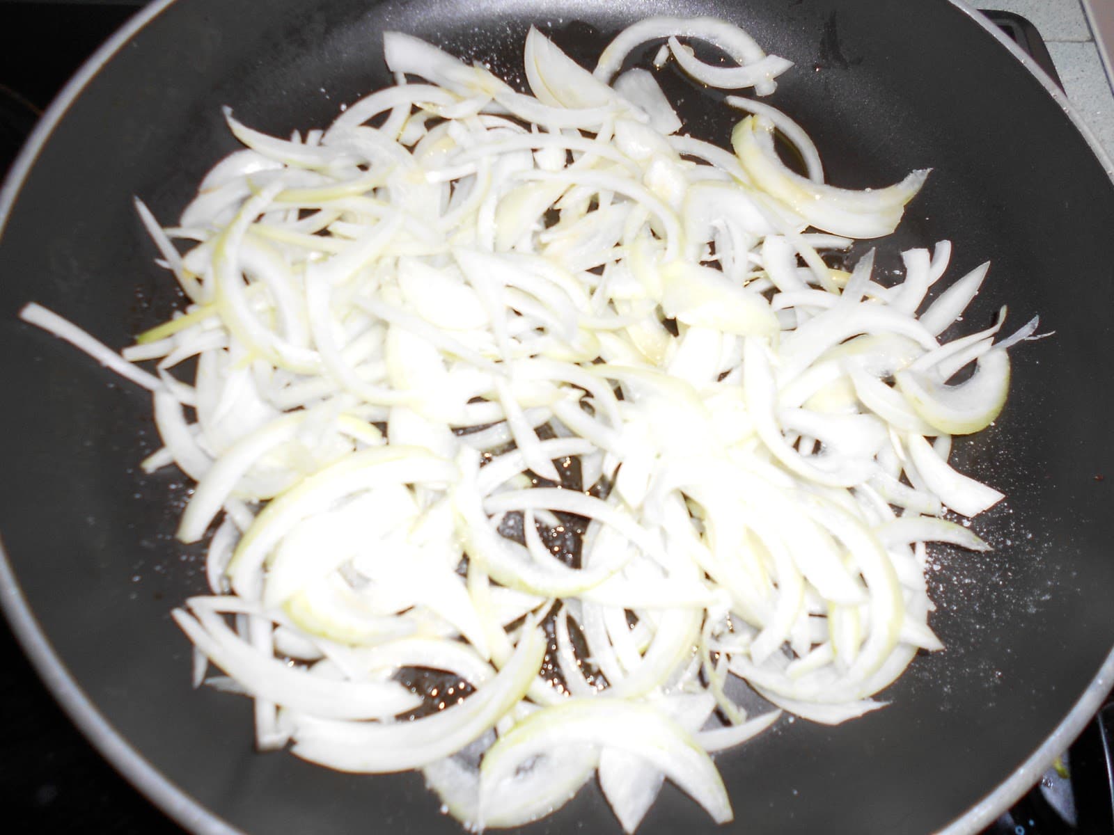 -Thinly slice onion and sauté with olive oil and salt until they become tender and translucent. Set aside. (Feel free to add some minced garlic if you’re into that.)