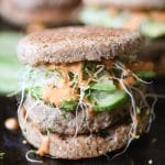 You could eat these delicious patties on their own (and I have), but I strongly recommend following my lead here and serving them on toasted Ezekiel muffins with crunchy cucumber, creamy avocado, a pile of spicy sprouts, and plenty of coconut-peanut sauce.