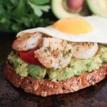 This may be the most epic version of avocado toast ever. (And I say that with authority because I eat some version of avocado toast at least four times a week.) A good piece of grilled bread topped with creamy avocado is heavenly, but add charred tomatoes, quickly sautéed garlicky shrimp with lemon and herbs, a perfectly cooked fried egg, and a generous sprinkling of Parmesan? FLAVOR BOMB. I mean, this is the avocado toast of your wildest dreams, people.