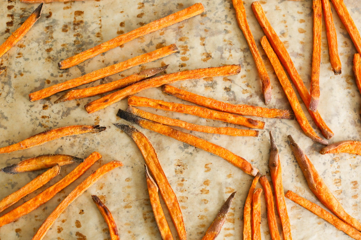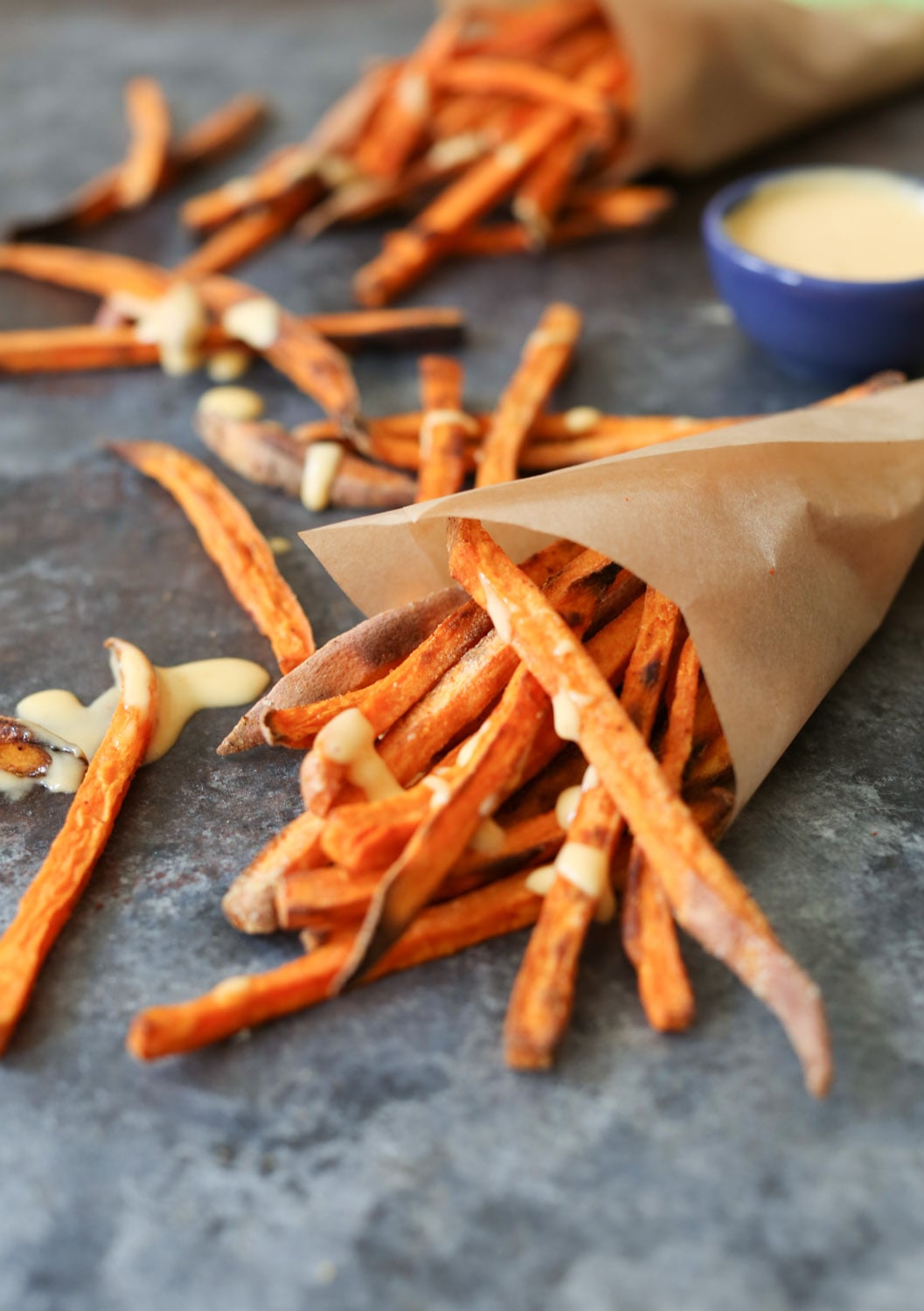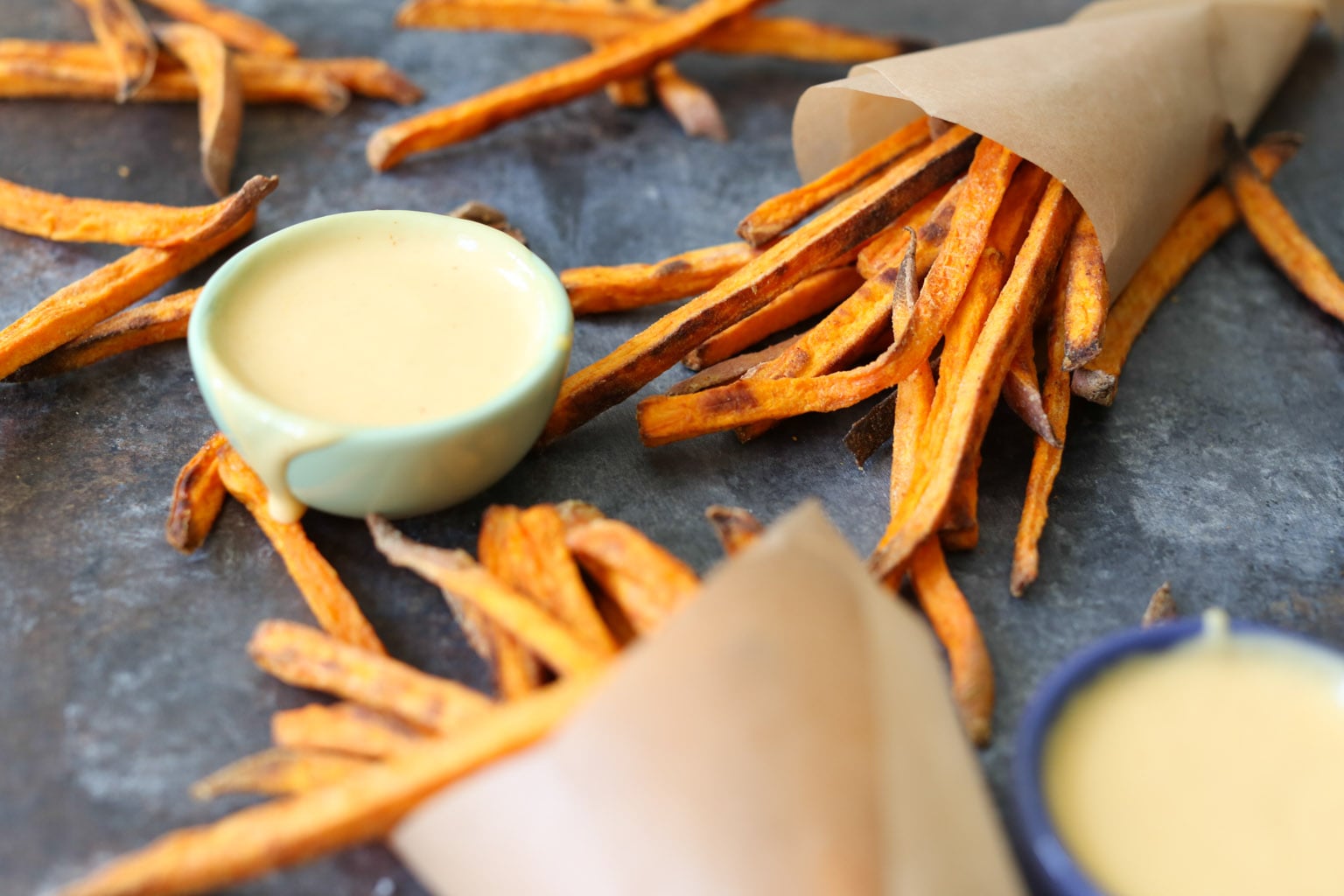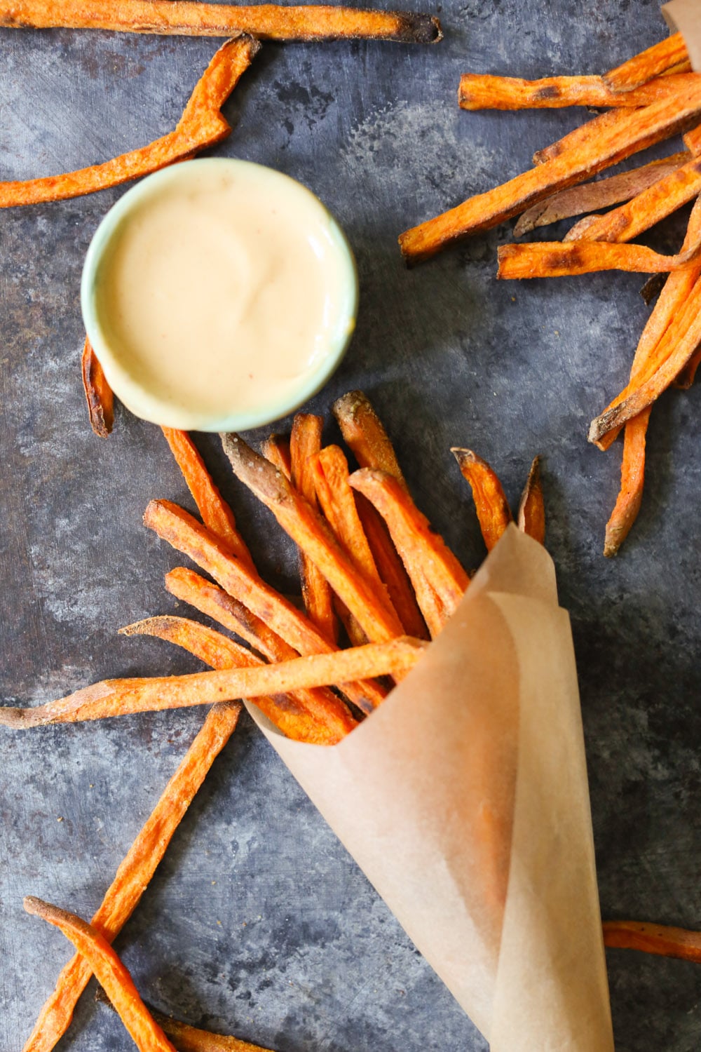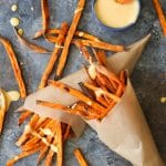 Baked sweet potato fries can be tricky, as they have a tendency to soften and caramelize in the oven instead of crisping up like their deep-fried counterparts, but these ones avoid that sad fate. Thanks to their matchstick cut and the perfect amount of starch, they get nice and crispy like a restaurant fry. And the dipping sauce! Dear GOD.