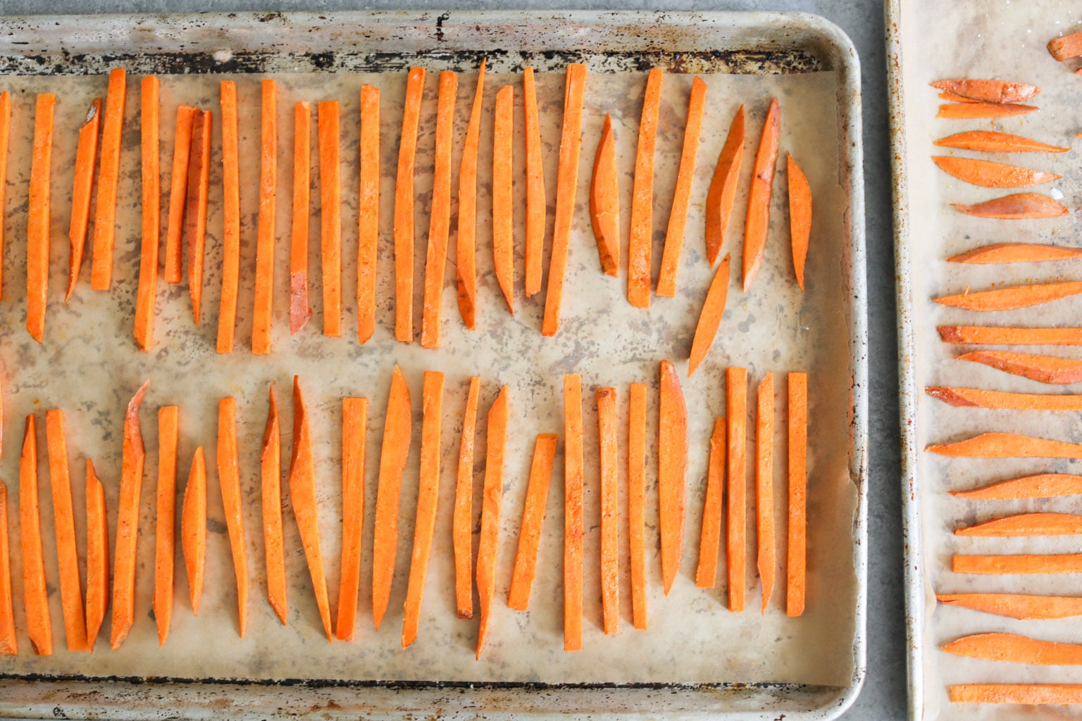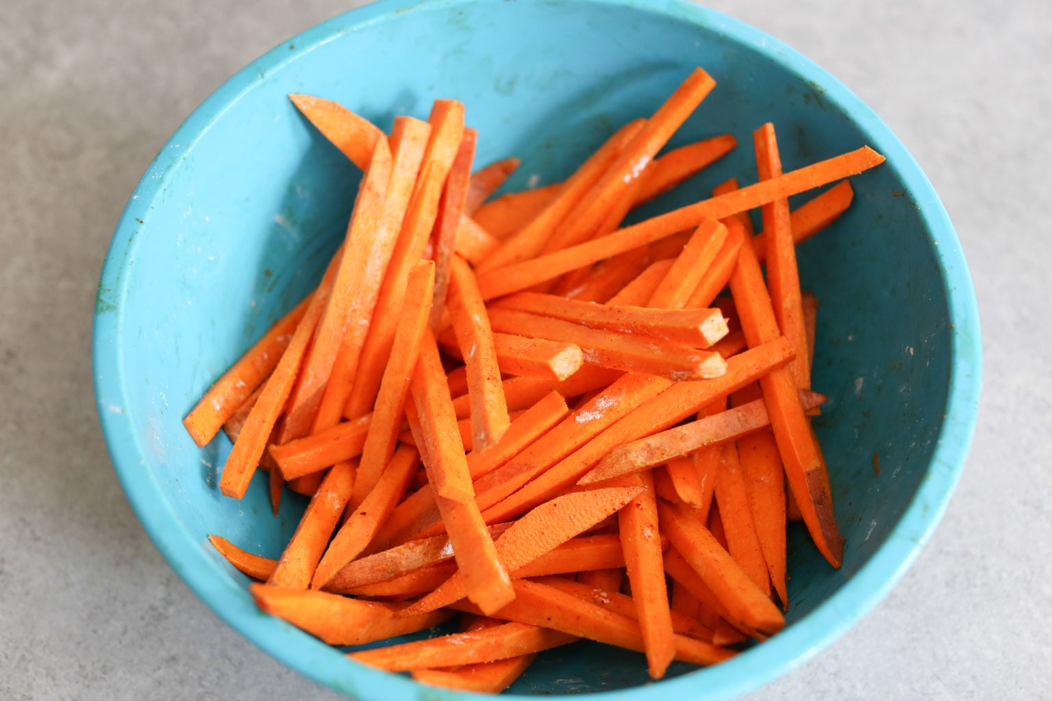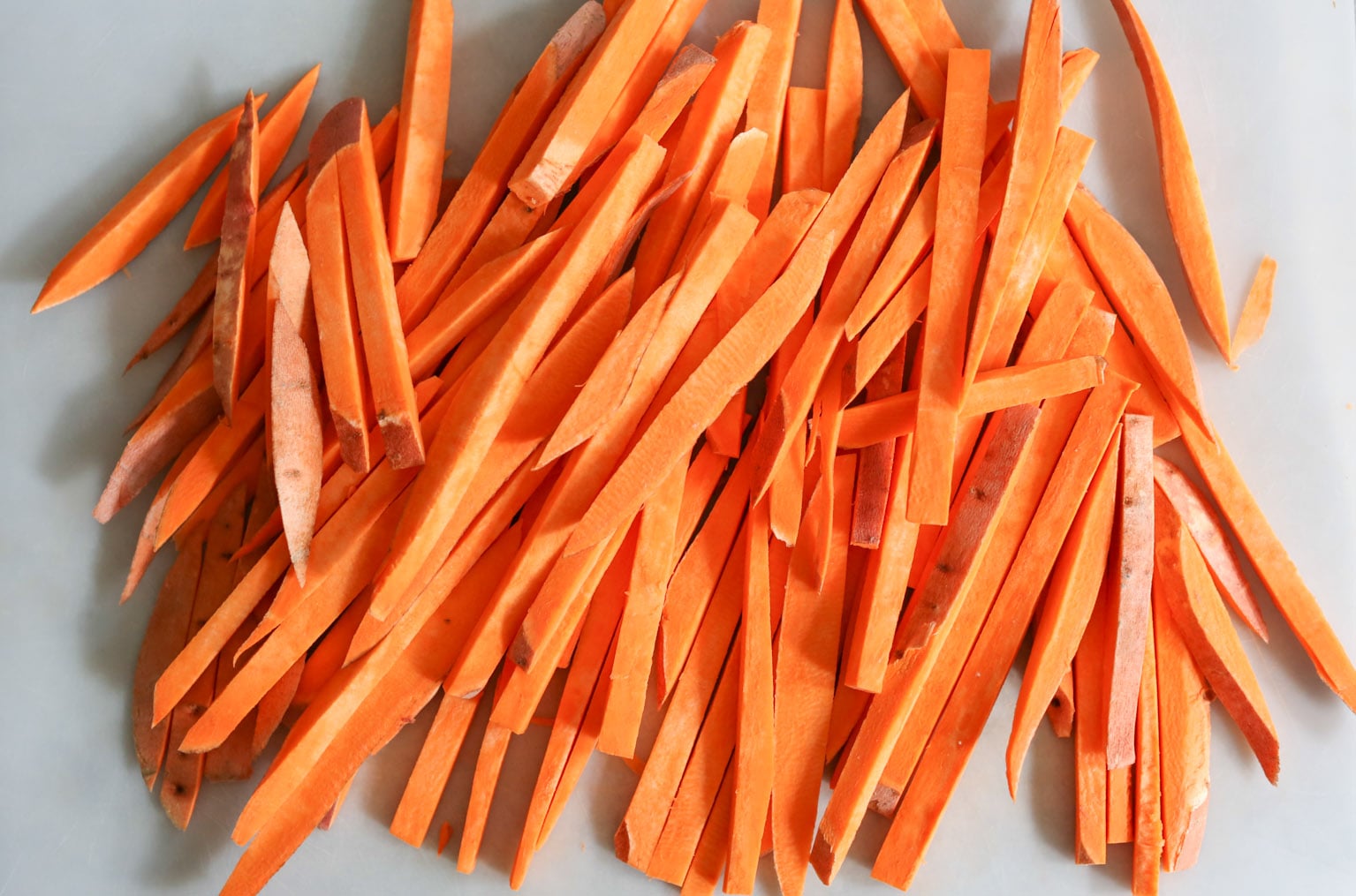 - Using a sharp chef’s knife, cut the top and bottom off the sweet potatoes and stand them on one of the flat sides. Cut each into thin planks, ¼-inch thick, and then into matchsticks. Add the potatoes to a large mixing bowl and toss with the olive oil. Sprinkle with the starch, salt, and paprika, and toss until well coated.