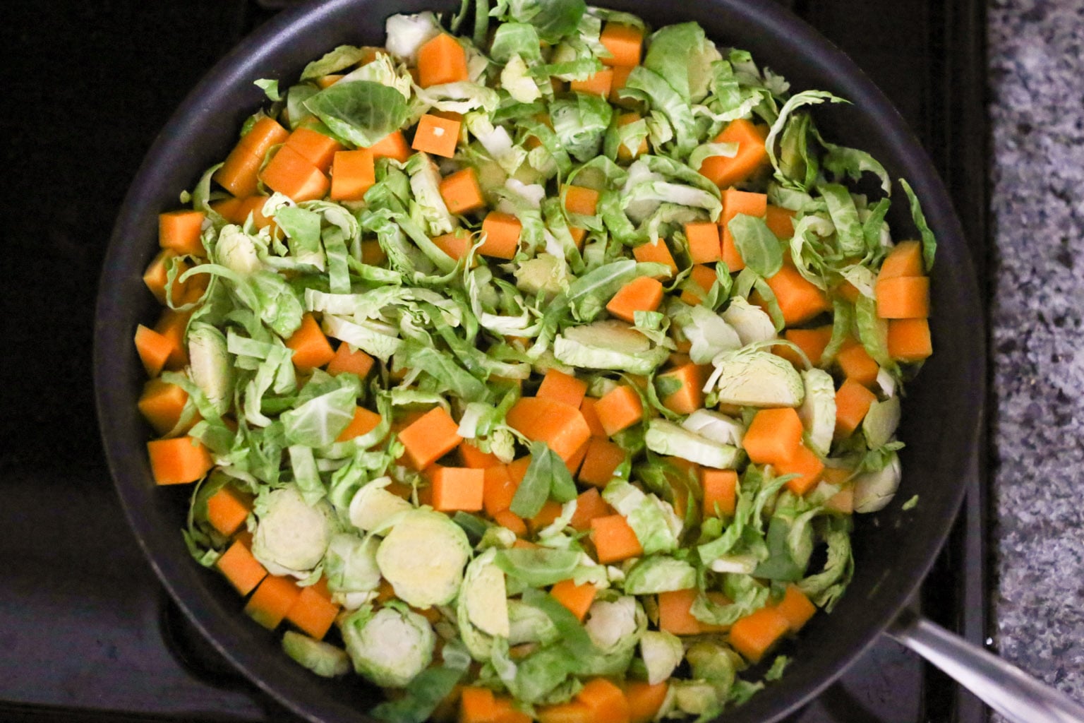 -Heat the olive oil in a large nonstick skillet over medium heat. When the oil is hot and shimmering, add the butternut squash and Brussels sprouts.