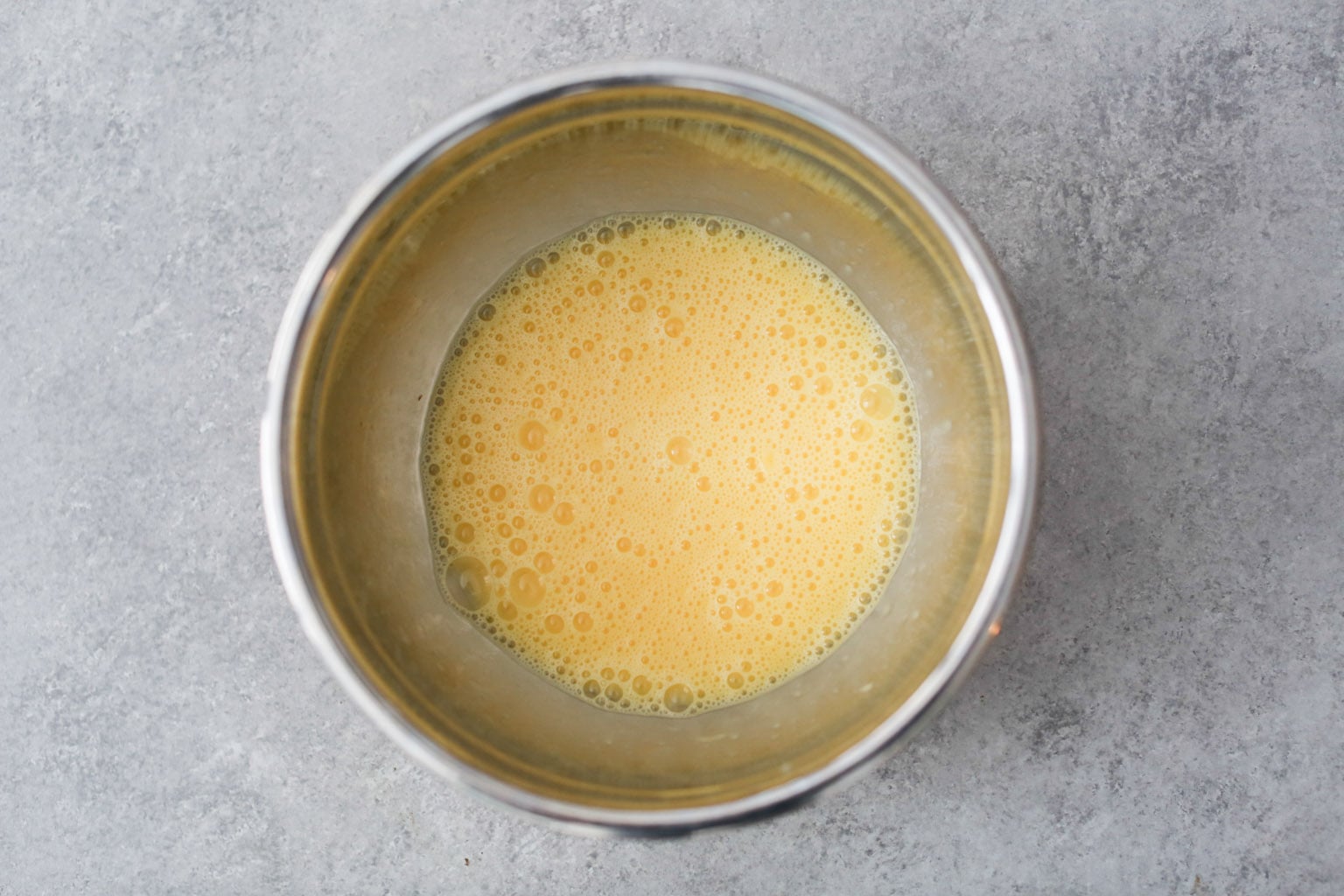 - Crack the eggs into a mixing bowl and whisk vigorously until pale yellow and slightly frothy.