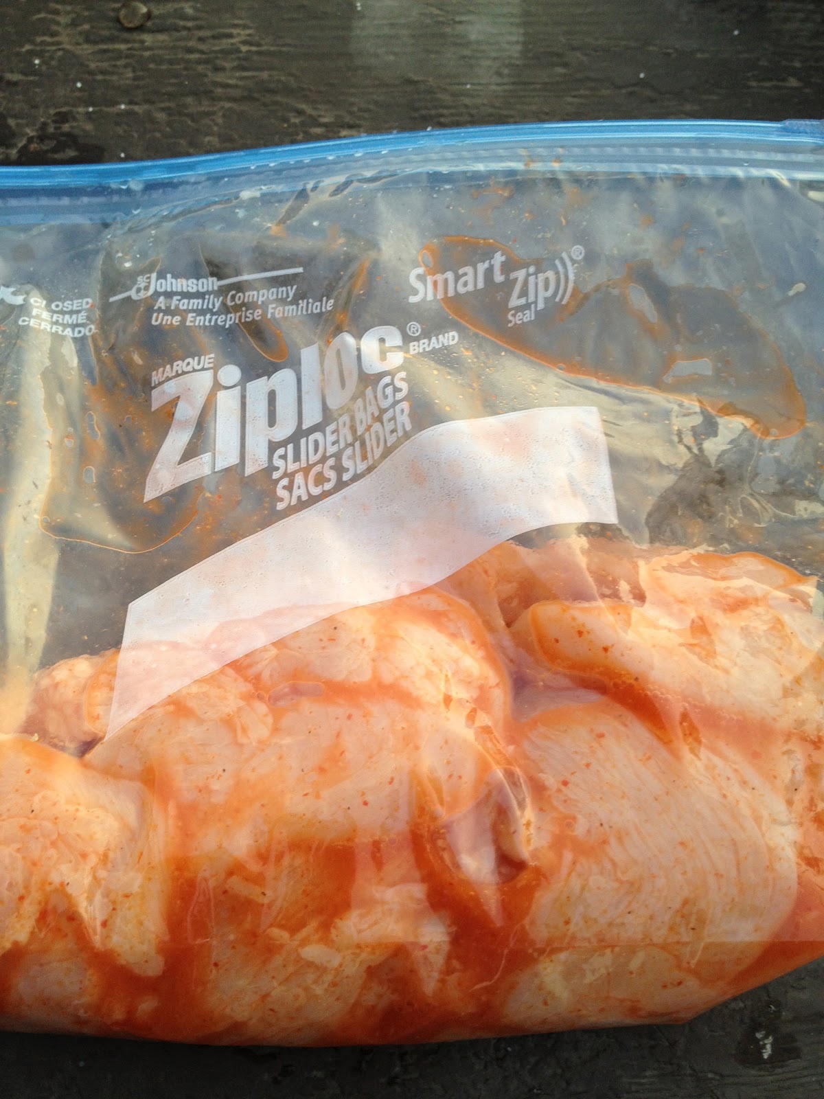 -Place the chicken in a ziploc bag and add the lime juice, Cholula, garlic powder, and salt. Shake it up to make sure the chicken is coated with marinade and toss the bag in the cooler for at least a half hour. Have a beer or something.