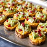 First order of business: Butternut Squash Crostini with Brussels Sprouts and Pomegranate. These sassy little numbers are one of my favorite bites in recent memory—and given last week’s epic T-Day feast, that’s saying a lot. A LOT, dammit. The flavors of sweet and savory butternut squash, earthy Brussels sprouts, and sweet-tart pomegranate are a match made in holiday heaven, but to really do this recipe justice, I feel the need to break things down for you layer by insanely delicious layer.