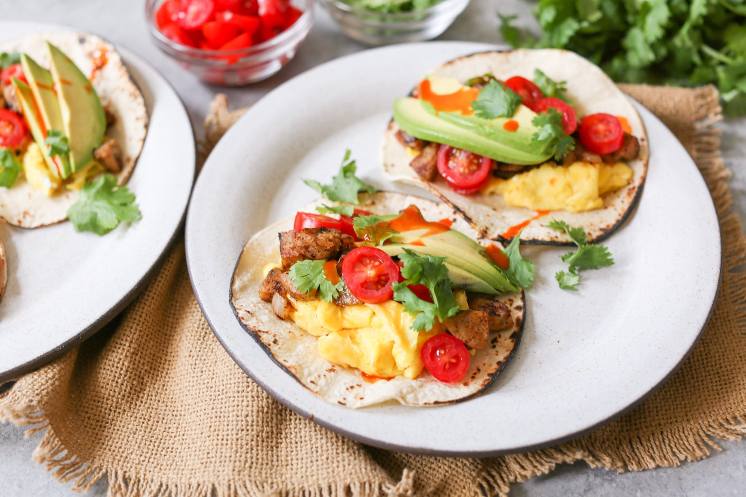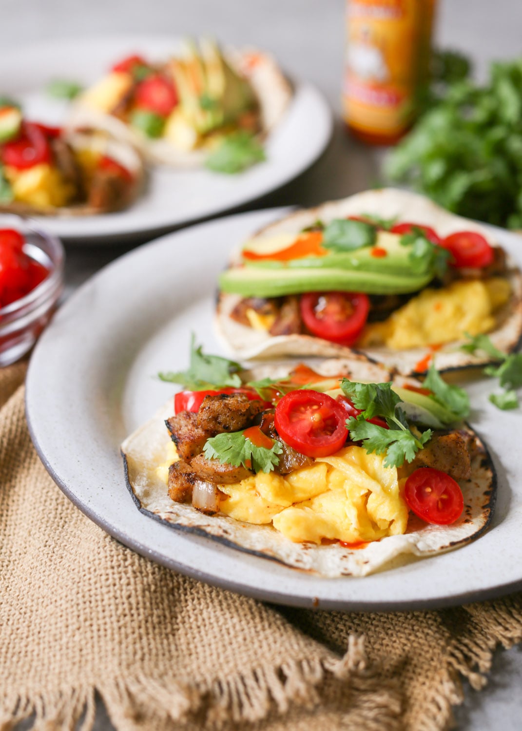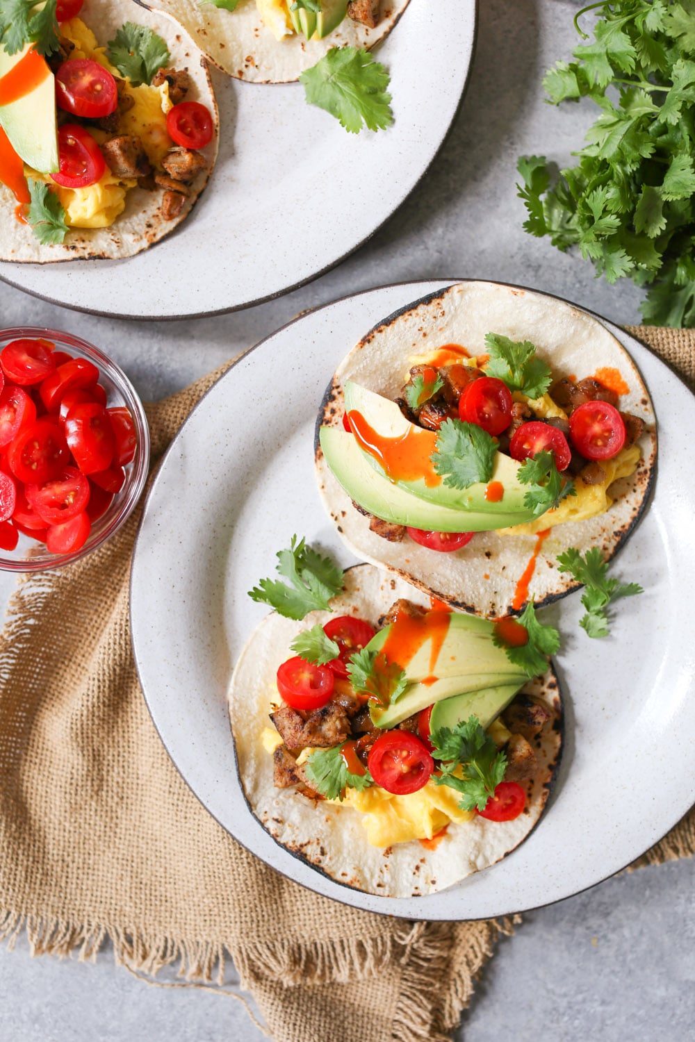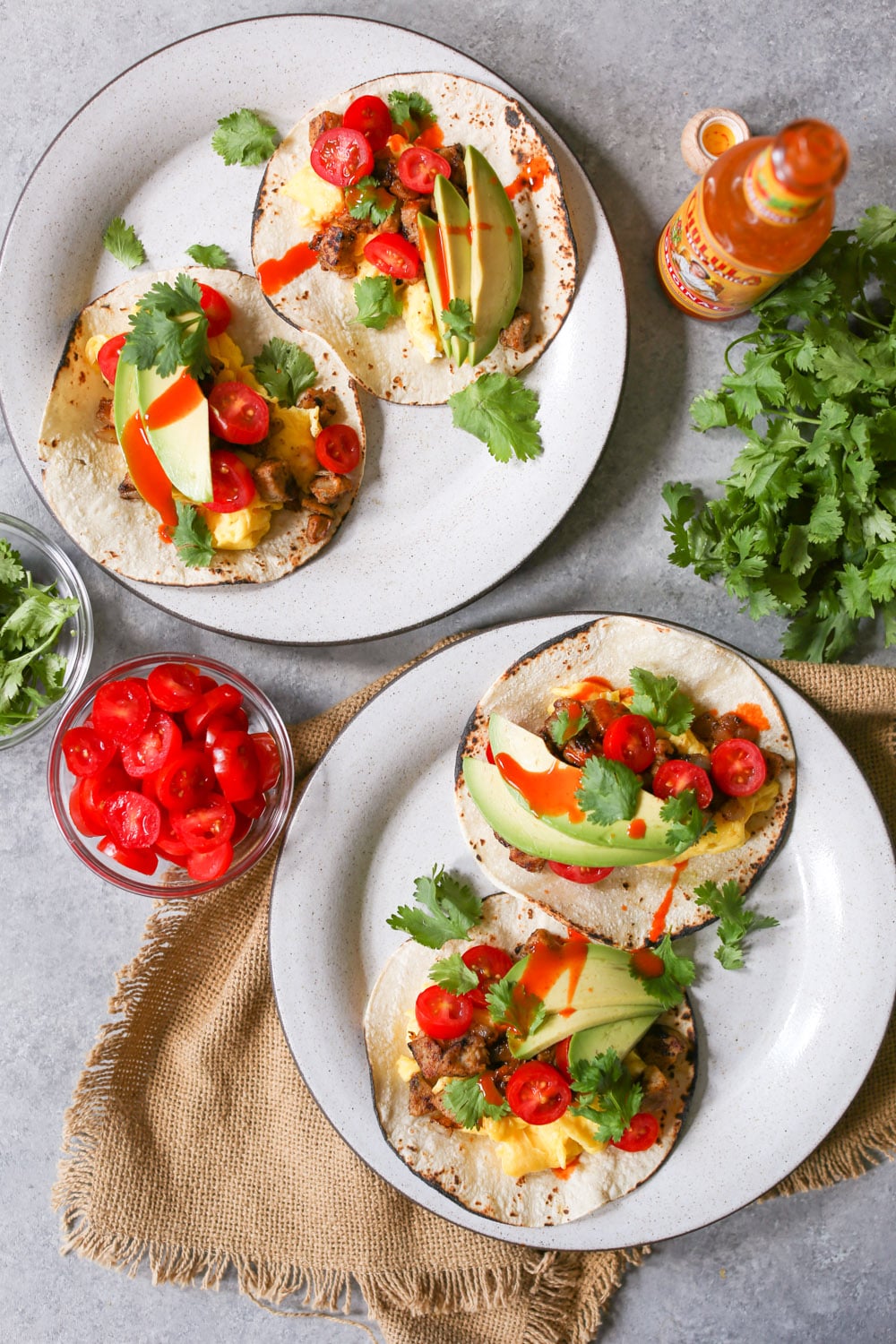 - Assemble your tacos! Each tortilla gets a scrambled egg topped with a heaping tablespoon of the sausage and onion mixture. Garnish with tomatoes, avocado, cilantro and hot sauce.