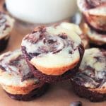 - Spoon about a tablespoon of brownie batter into the well sof the prepared mini-muffin tin(s). Add a dollop (about ½ tablespoon) of the cheesecake swirl batter to each well. Use a knife to swirl the cheesecake into the brownie batter.