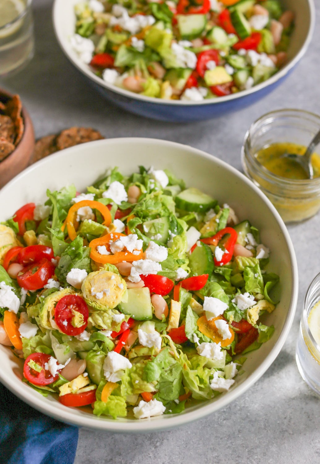 Given that most humans are on a clean(ish) eating streak right now, I thought this fresh chopped salad would be an appropriate first recipe of the year. It’s light, fresh, and packed with nutrients, but it also knocks it out of the flavor park, which is crucial. I call it a “clean out the fridge” salad because it’s more of a template for an epic salad than a strict recipe. I’m particularly fond of the cannellini bean and veggie combo here, but you can easily sub whatever ingredients you happen to have on hand. In short, you’ll need 2 cups chopped lettuce, 1 cup beans, 4 cups chopped veggies of your choice, and an optional sprinkling of cheese. Toss everything with a super simple lemon-thyme dressing, and BOOM. Done.
