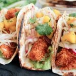 Crispy Fish Tacos with Mango Salsa and Avocado Salsa Verde