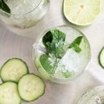 - In a cocktail shaker, muddle the chopped cucumber with the lime juice. Add the vodka, simple syrup and a few ice cubes, and shake vigorously until the outside of the shaker becomes frosty. Strain into a glass filled with ice (I like crushed ice for this), and top with Prosecco. Garnish with the cucumber slice and mint sprig.