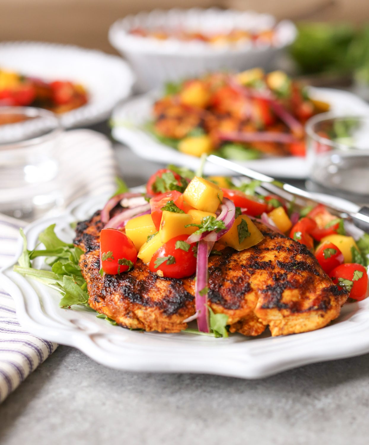 This is my favorite marinated and grilled chicken recipe for the summer — it is SO freakin’ good. I would never have thought to use this combo of spices for a marinade but wow do they pack a punch. I’ll usually let this marinade for at least an hour and sometimes I’ll make extra so I can use the chicken on salads throughout the week. The relish is so fresh and delicious as well. If I can’t find ripe mango, I’ll buy and drain the mango chunks (in 100% juice) from the store and they work great too. This recipe is a hit with everyone I’ve made it for — try it out!