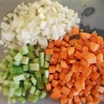- Peel your carrots, celery, and onion, and then chop each mirepoix- this is a fancy French term that I shall poetically translate as “rough cubes.”