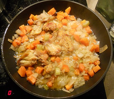 -Heat some oil in a saucepan, and when it is very hot (spitting), add the chicken wings. Keep on the heat until they are a golden brown, stirring intermittently. Remove from heat.