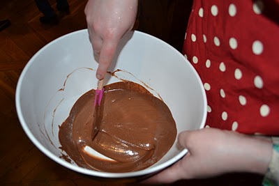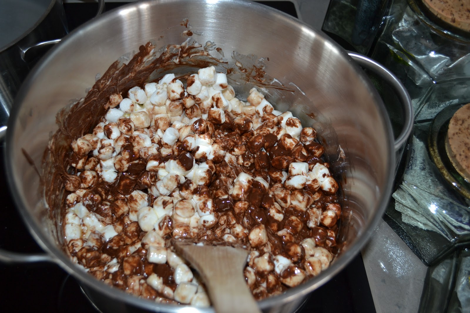 -When butter/marshmallows has turned into a mushy goo, add melted chocolate. Mix.