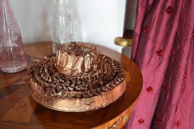 I went to a specialty store and bough edible gold dust. (William Sonoma definitely has this, and I will find some other links to share with you for ordering online.) You put it on the tip of a knife and just blow it around the cake to cover the whole thing. Don’t freak out about germs. People blow out birthday candles all the time and nobody gets sick. Et voila! A beautiful boxed cake!