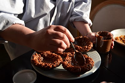 -Let them cool in fridge for about 30 minutes. Then use a spoon to spread a very very thin layer of nutella in the bottom of each crisp (optional). Then back in the fridge!