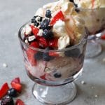 Anyhoo, these sundaes are a play on classic Eton mess, made with your 4th of July feasts in mind. And as far as patriotic desserts go, it doesn’t get more refreshing or low-maintenance than these red, white, and blue beauties. Just toss summer berries with a little sugar and a splash of St-Germain, crumble a few of your finest store-bought meringues, and layer the fruit and cookies with a generous amount of vanilla and strawberry ice cream. Done and done. The recipe makes four large sundaes, but if you’re having a fancy dinner party or planning to serve multiple treats at your BBQ, feel free to scale things down and make eight adorable mini treats.