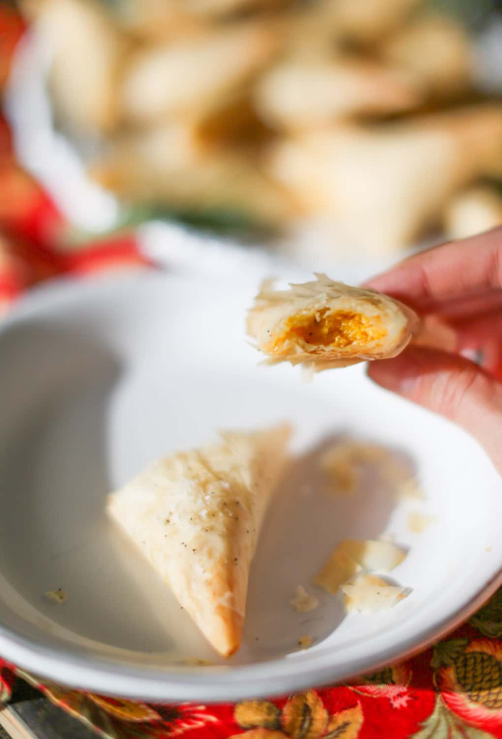These Harvest Squash Phyllo Turnovers are one of my most recent squash toast-inspired recipes, and they were too delicious not to share. All of the toppings I just described are folded together along with a little sage, nestled inside triangles of Athens phyllo dough, and then baked to flaky perfection. The result is an endlessly crowd-pleasing handheld treat that’s perfect for entertaining. Keep them in mind as we enter the holiday season, peeps.