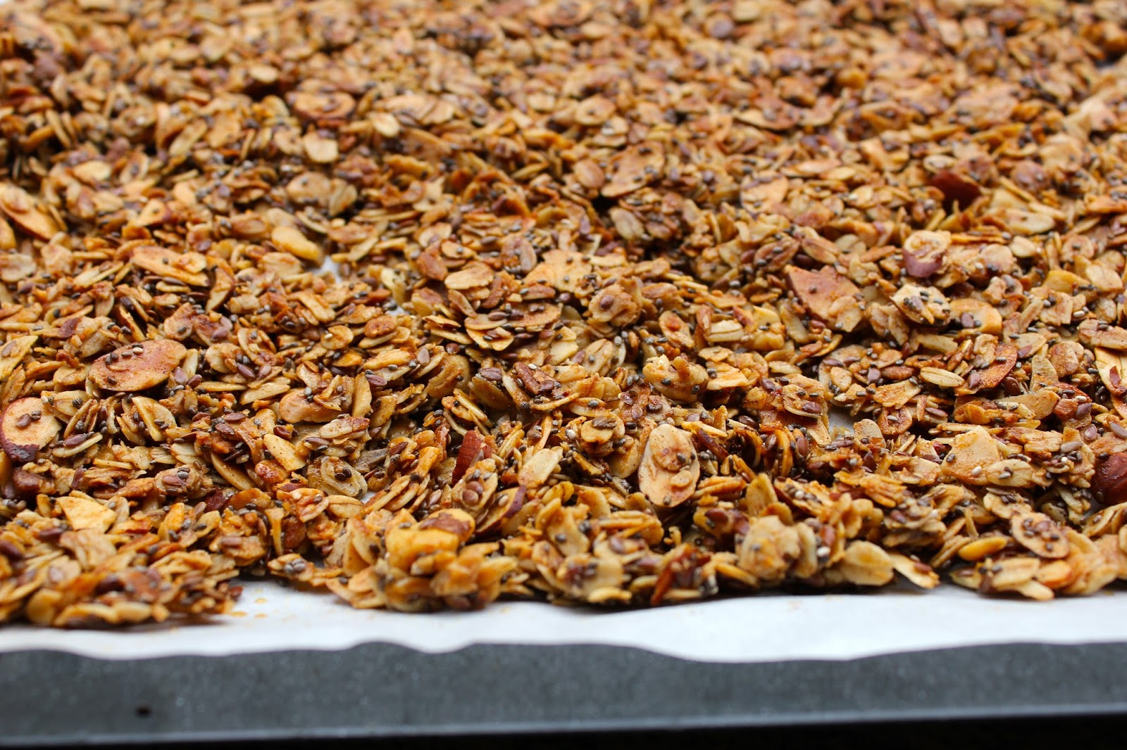 - Spread the granola onto 2 parchment-lined baking sheets.