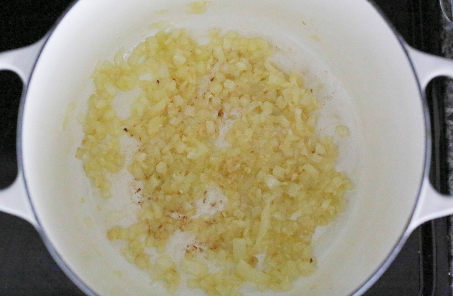 - Heat the olive oil in a medium Dutch oven or heavy-bottomed soup pot over medium heat. When the oil is hot and shimmering, add the onion, garlic, and a pinch of salt and cook for about 5 minutes until the onions are very soft and translucent. (Be very careful not to burn the onions and garlic, people!! If they start to brown at all, turn down the heat immediately.)