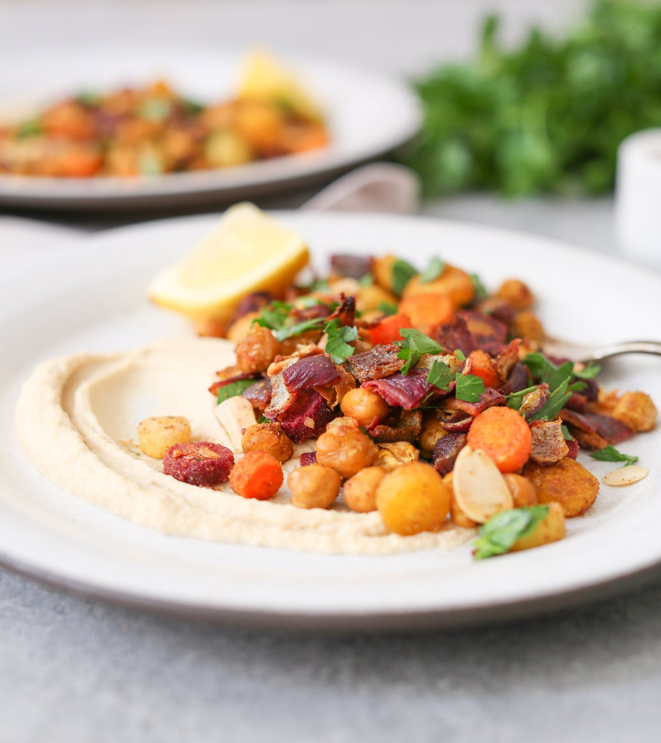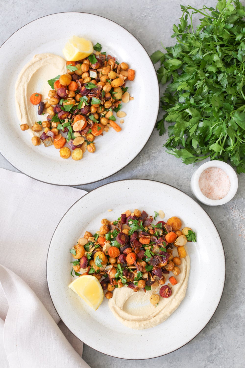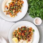 - -Stir in the toasted almonds and parsley, and serve alone or over hummus (or greens!) with an additional squeeze of lemon.