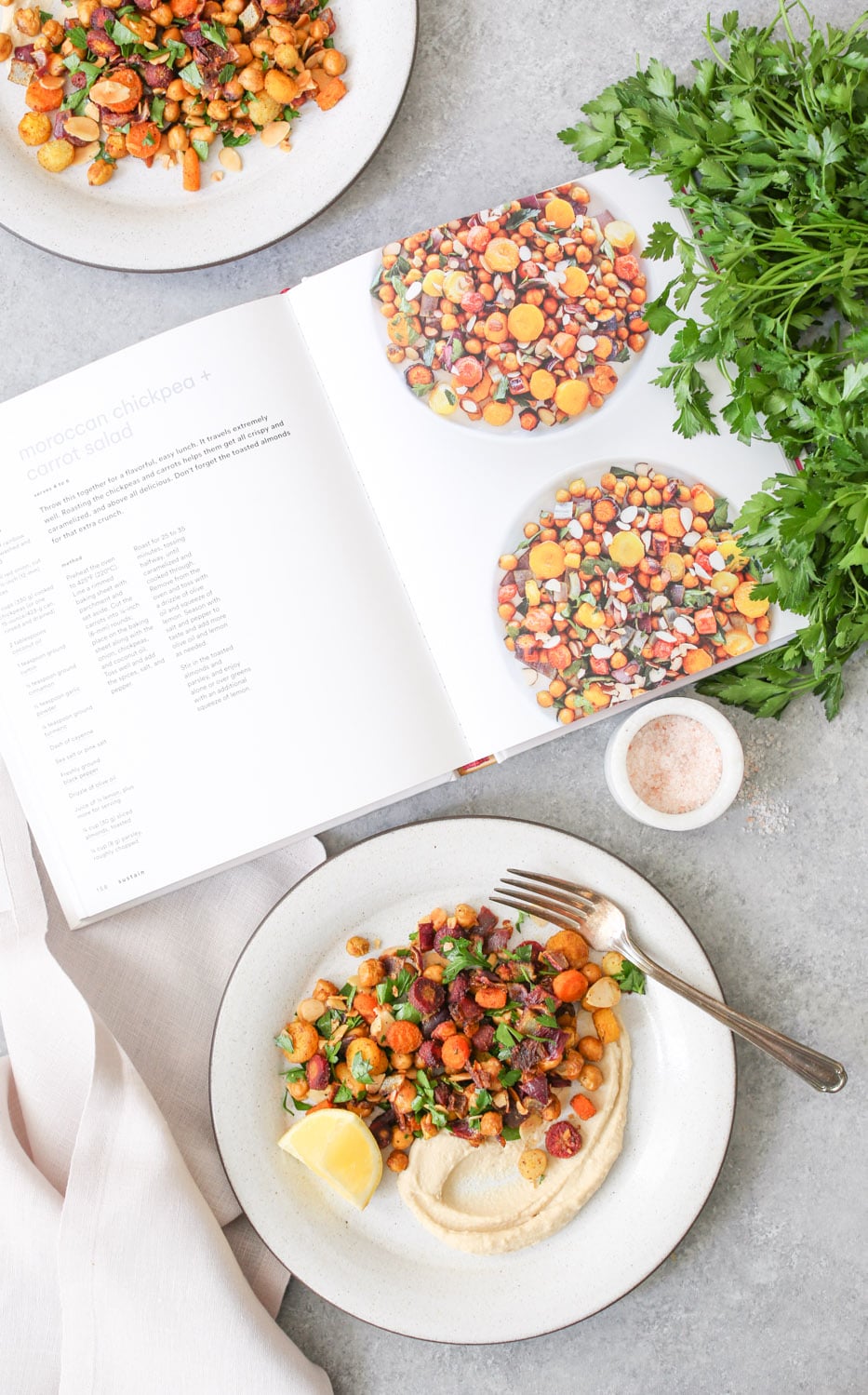 Come Monday morning, I was a hot mess, and the thought of making/eating another cake seemed irresponsible at best. So, I went in a decidedly healthier direction with my birthday cooking, taking a literal leaf out of clean queen Lily Kunin’s new book Good Clean Food: Super Simple Plant-Based Recipes for Every Day and whipping up this epic Moroccan Chickpea and Carrot Salad.