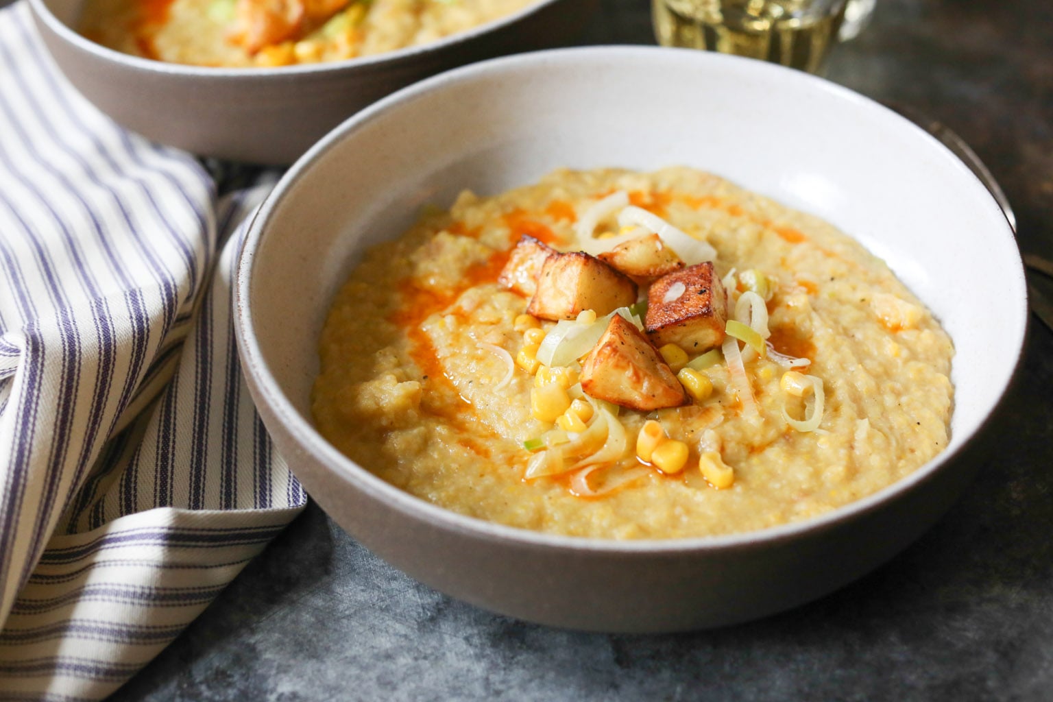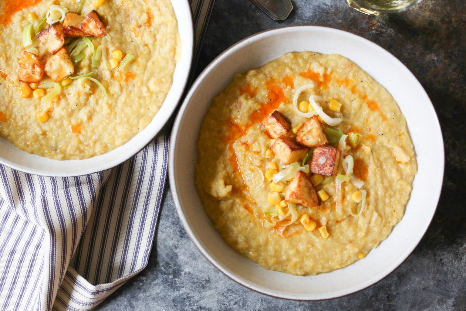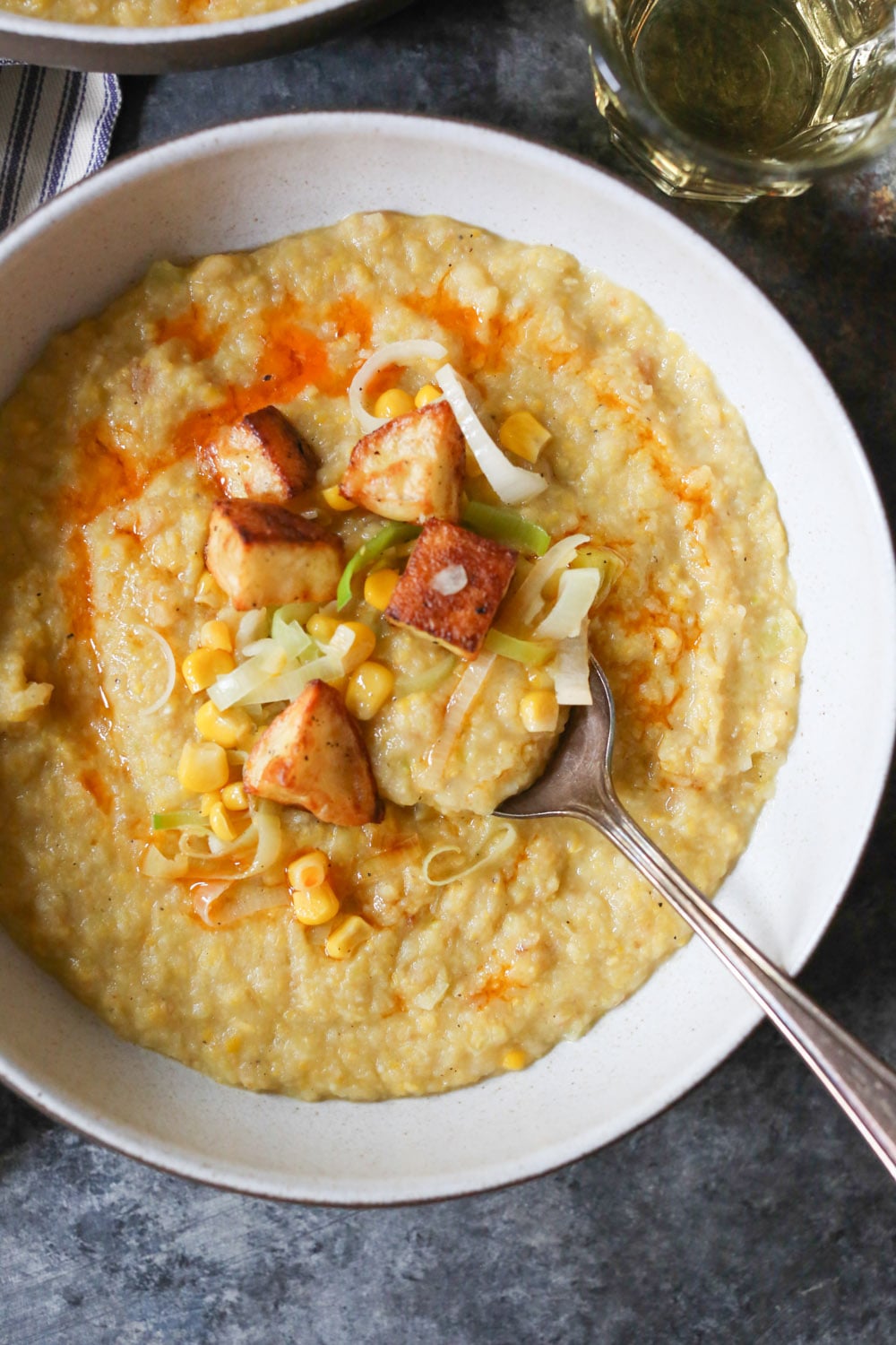 This Roasted Potato, Corn, and Leek Chowder is ripped straight from OPP’s pages, and it is fantastic. What’s surprising about this vegan chowder is how hearty and flavorful it is given the few, very basic ingredients required. Coconut milk provides a subtle creamy sweetness (don’t worry, it doesn’t taste notably coconut-y), and roasting the potatoes serves up unexpected depth. I’m also pleased to report that the recipe comes together super fast (minus the potato roasting time) and requires zero culinary skill, which is always a plus.