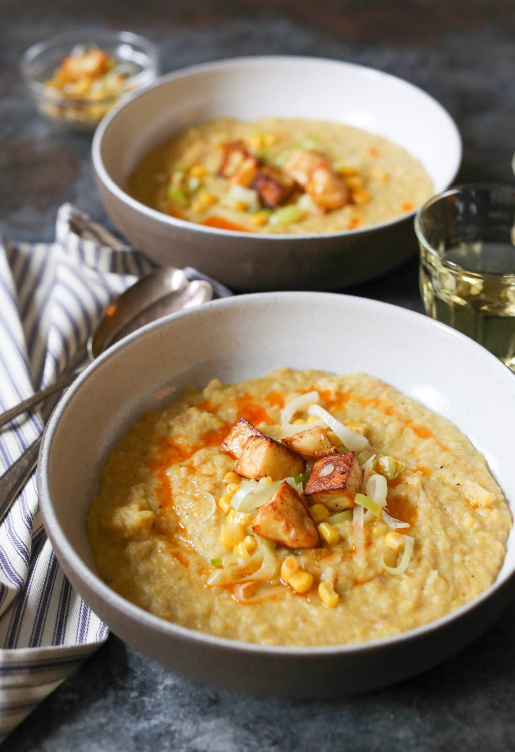 - When you’re ready to serve, transfer the soup to individual bowls and garnish with a little of the reserved potato, corn and leek mixture on top.