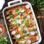 - Garnish enchiladas with extra cilantro, radishes, and hot sauce (or toppings of your choice) and serve warm.