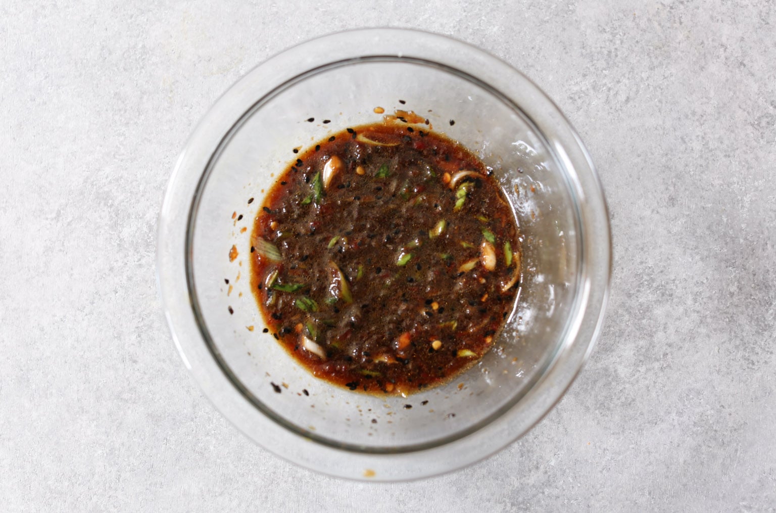 -In a mixing bowl, whisk the soy sauce, onion, scallion, sesame oil, Sambal Oelek, garlic, scallion, and sesame seeds.