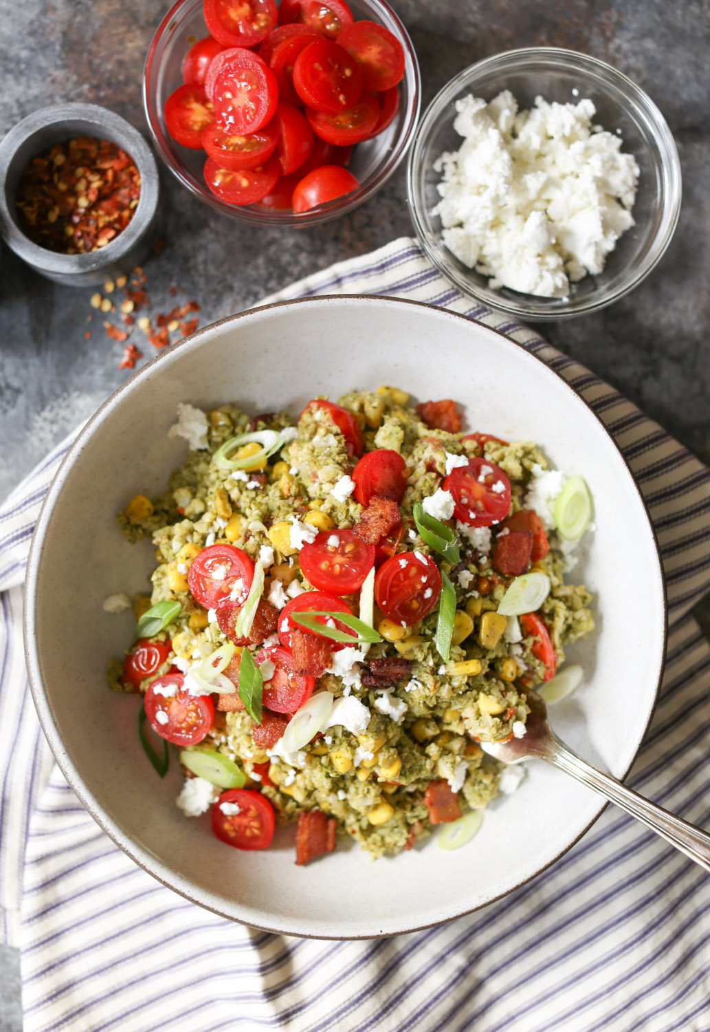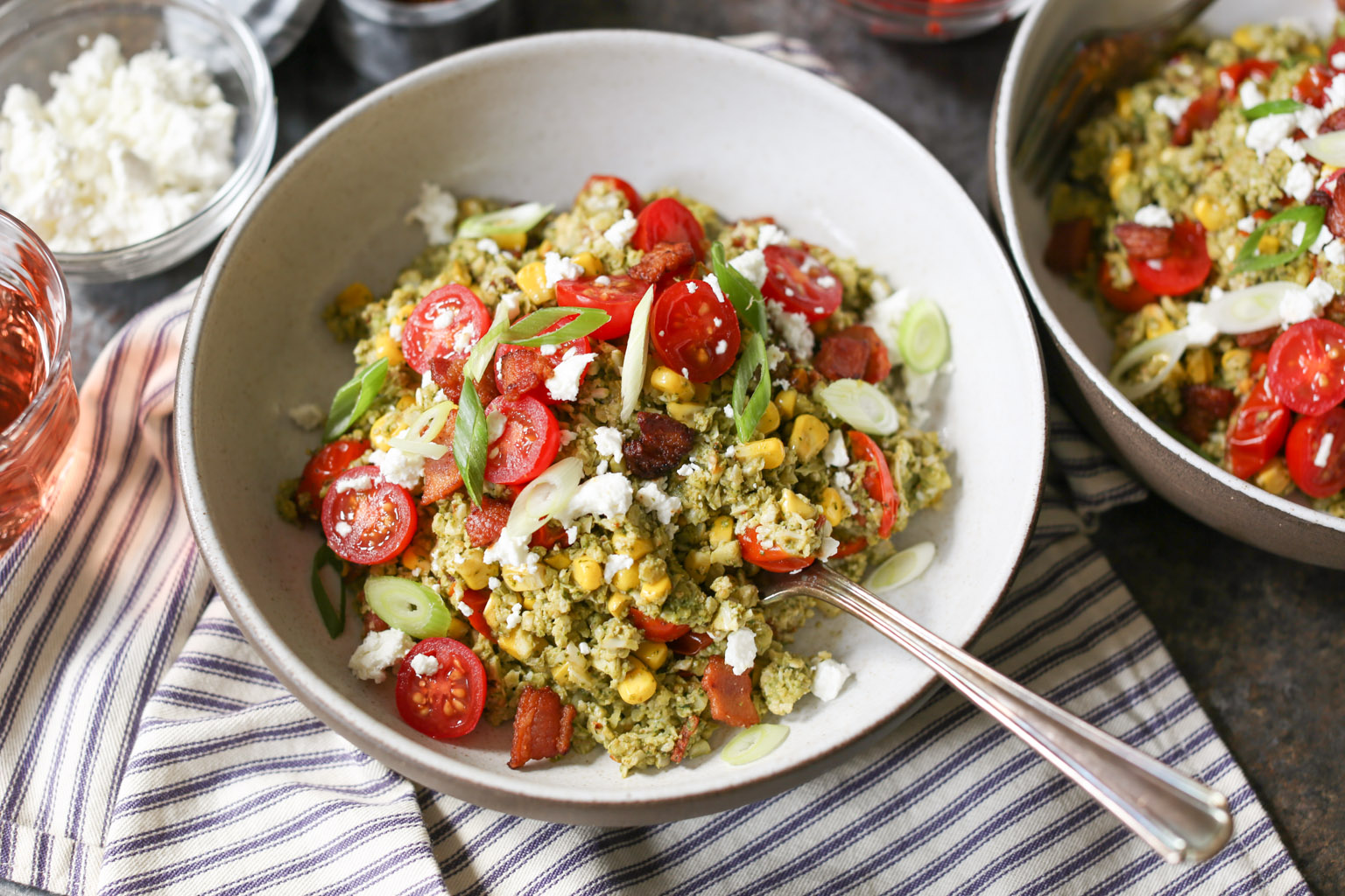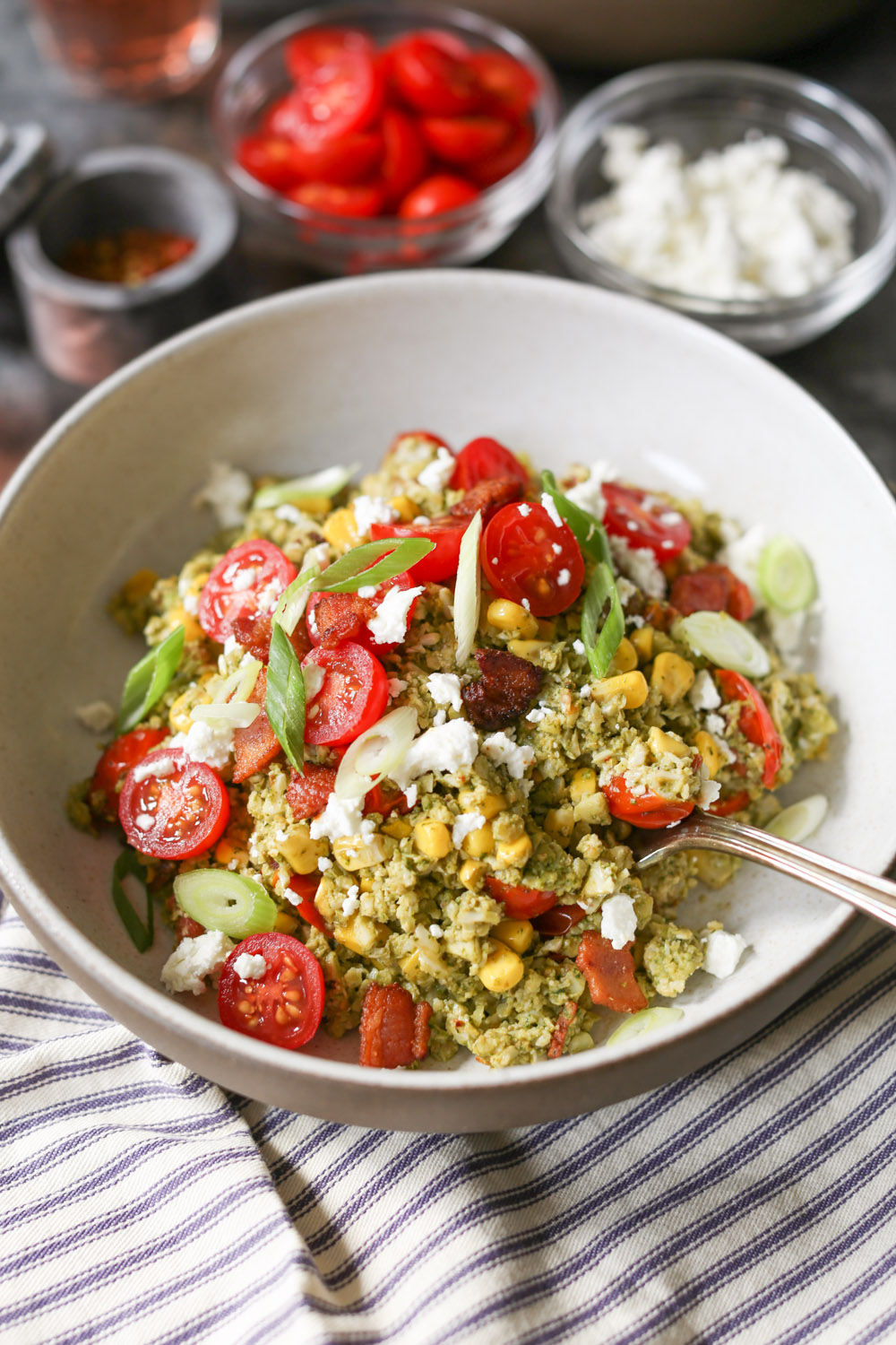Summer Cauliflower Rice Bowls with Bacon and Pesto