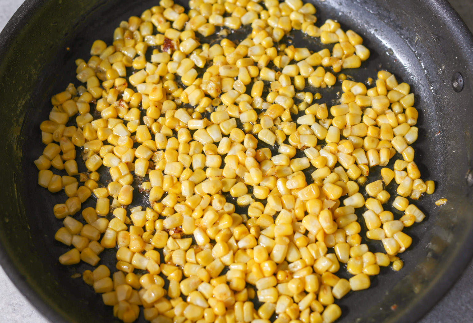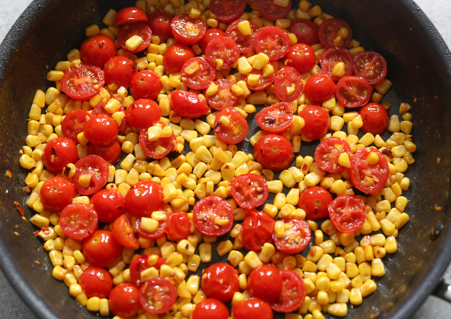 - Add the corn to the skillet and cook for 2-3 minutes until just tender and lightly browned in spots. Set about half a cup of the tomatoes aside. Add the remaining tomatoes to the skillet along with the crushed red pepper. Cook for 1-2 minutes until the tomatoes are just beginning to soften. (Don’t overcook the tomatoes, friends. They’re going to cook more once you add the “rice.”)