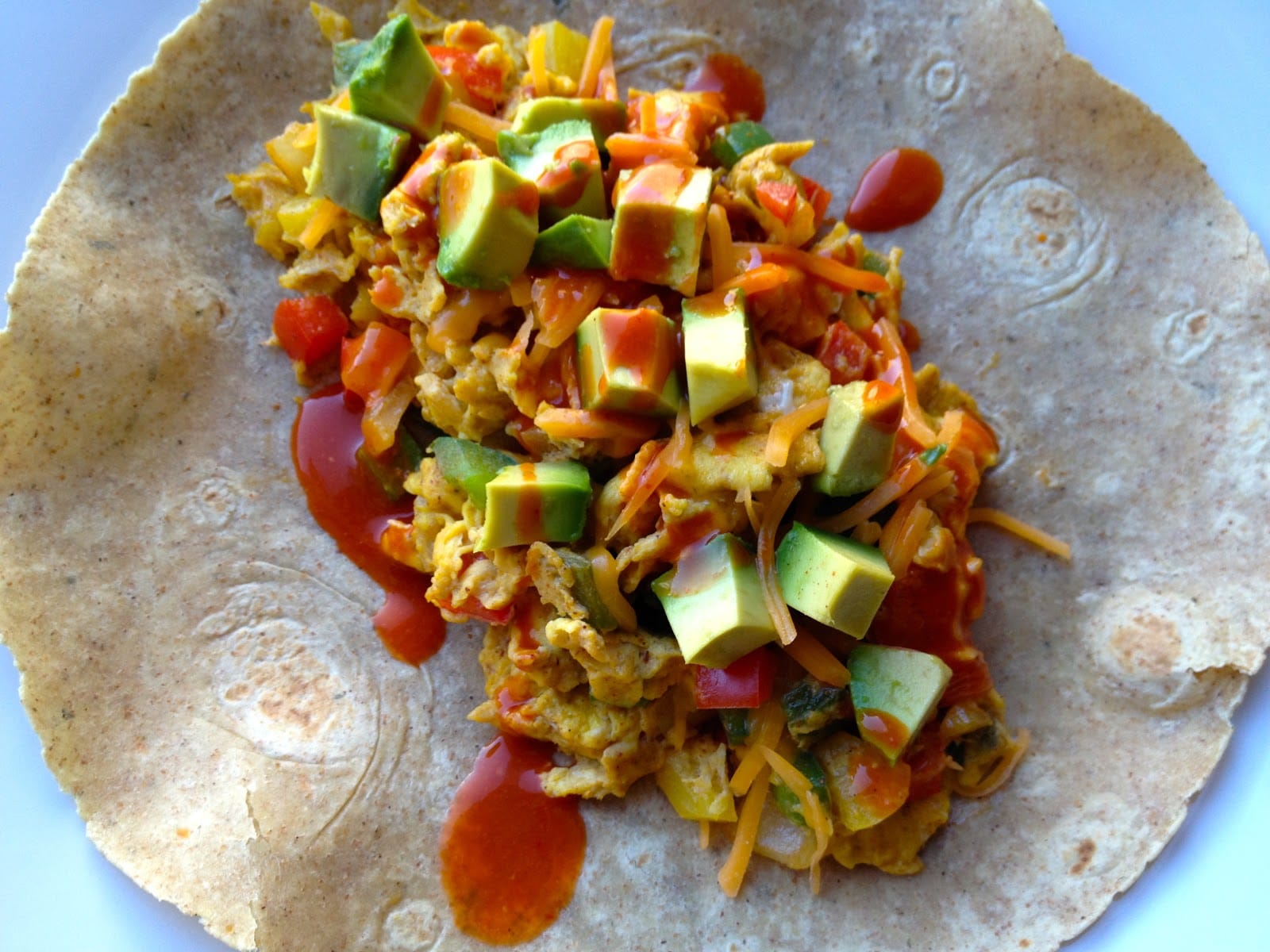 - Microwave the tortilla for 10 seconds. Place your scramble in the center of the tortilla and top with the cheddar cheese, avocado, and a drizzle of hot sauce (if using). Roll that bad boy up and enjoy your guilt-free breakfast fiesta.