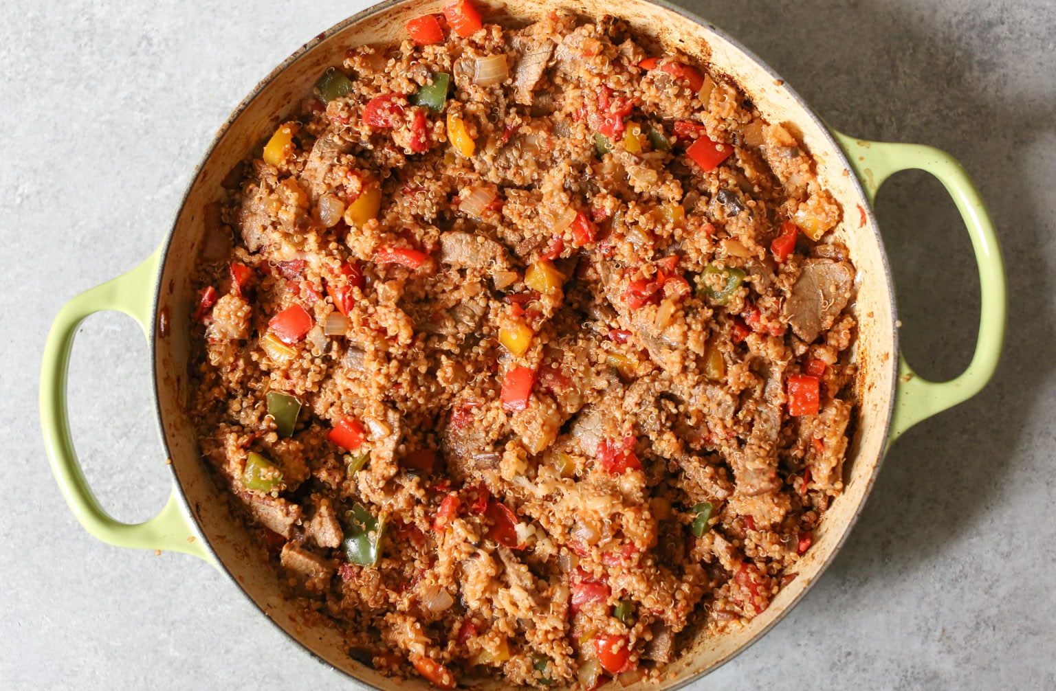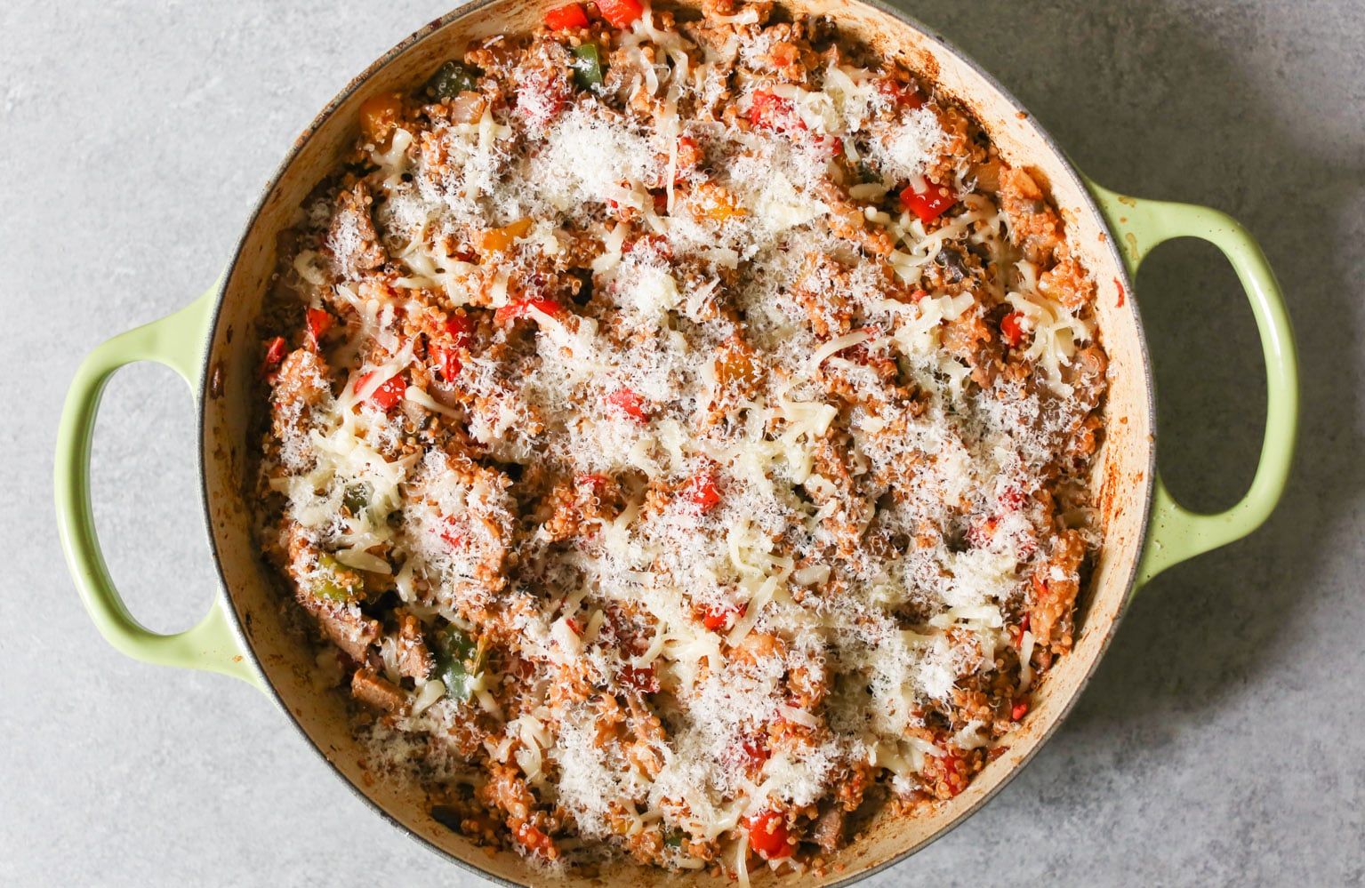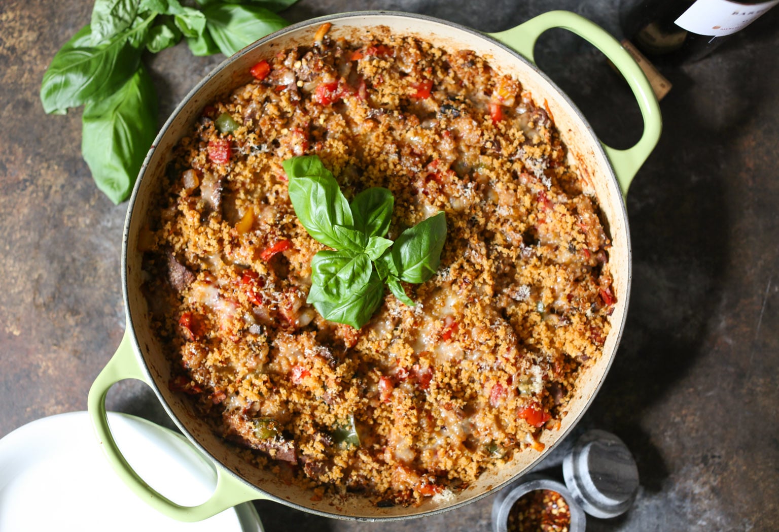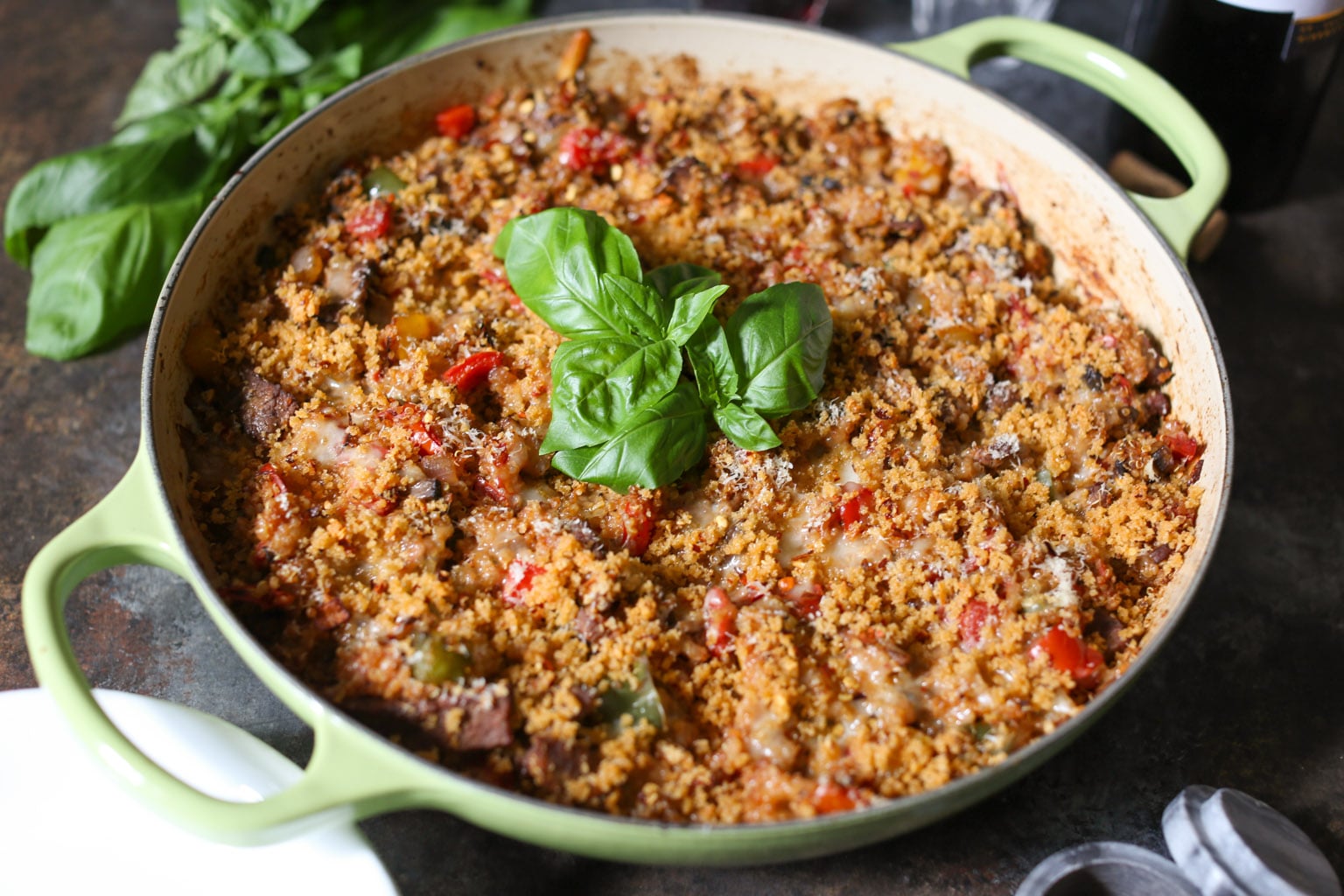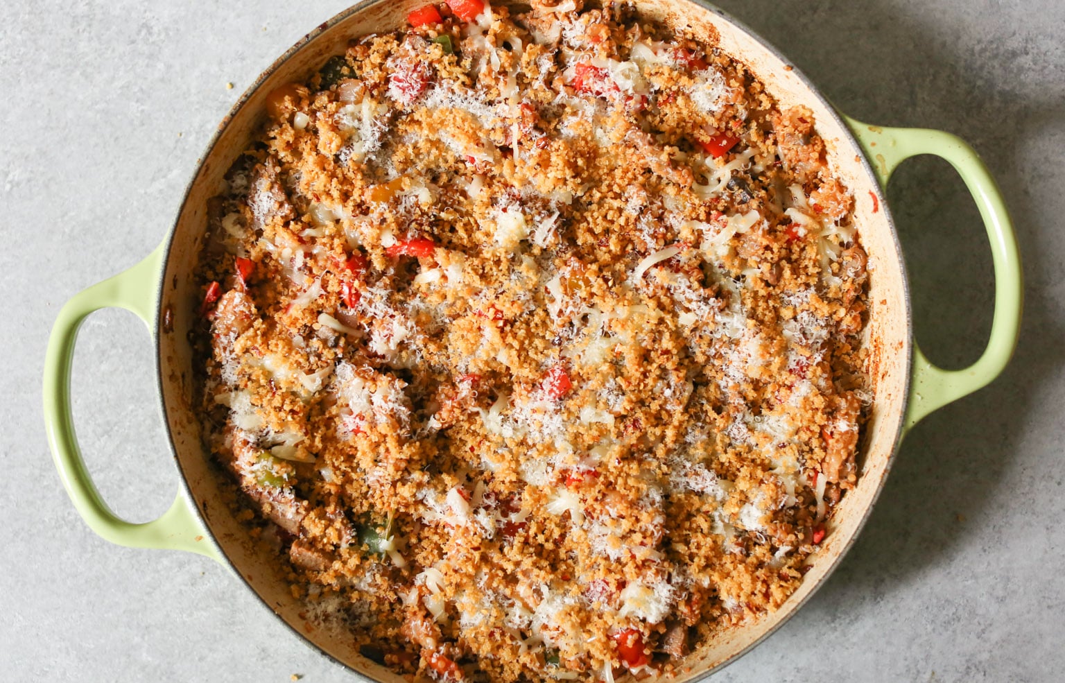 - Return the steak to the pan, then add the cooked quinoa, marinara, and 1 cup of the grated Provolone. Fold everything together until well combined. Taste the filling and season with extra salt and pepper if necessary. Gently smooth the top of the filling, then sprinkle it with the remaining Provolone and the Parmesan cheese and top with the prepared panko mix.