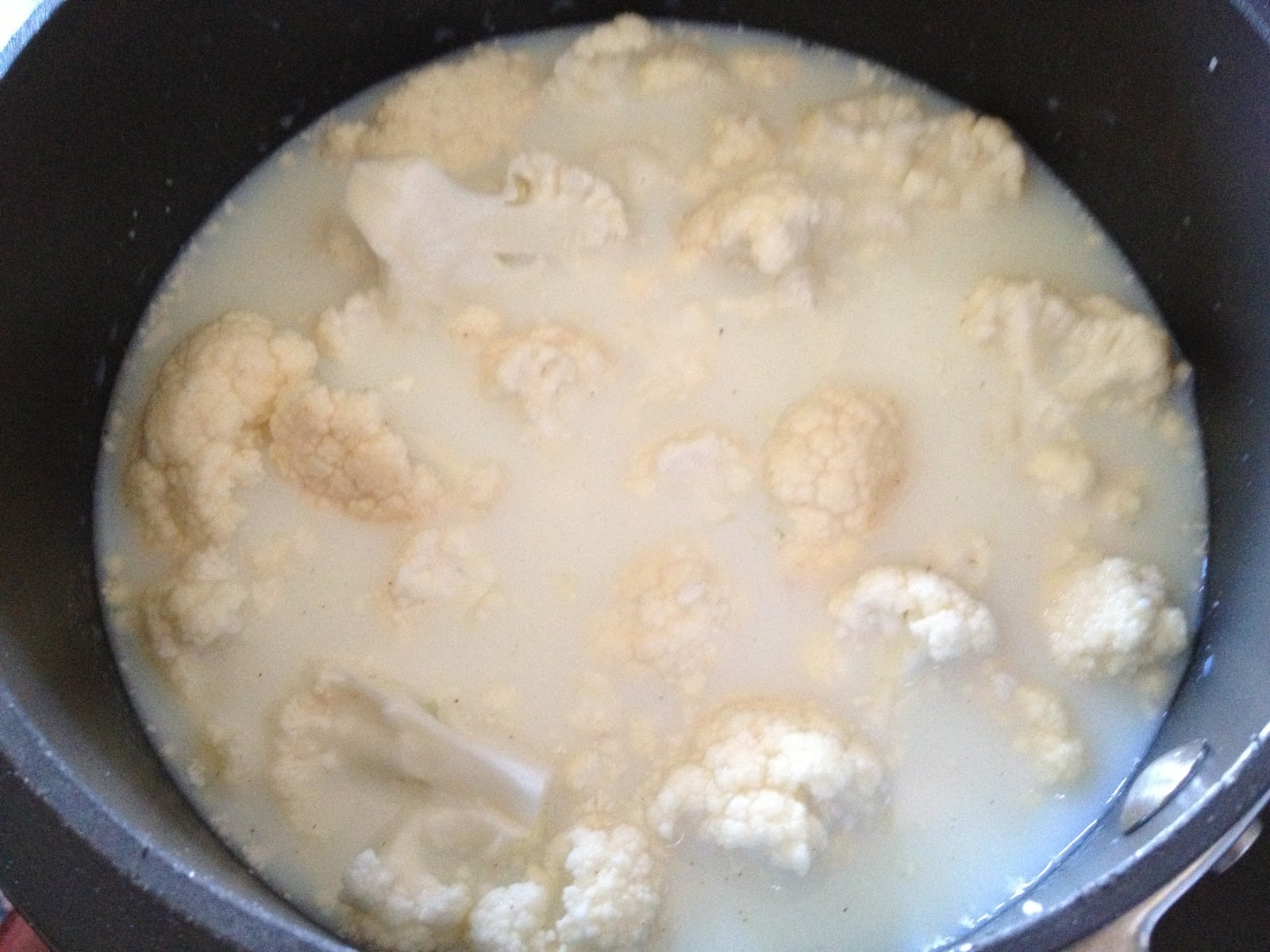 - Put the cauliflower and milk in a medium-sized pot. Bring to a simmer. Simmer covered for about 15 minutes until the cauliflower is very tender.