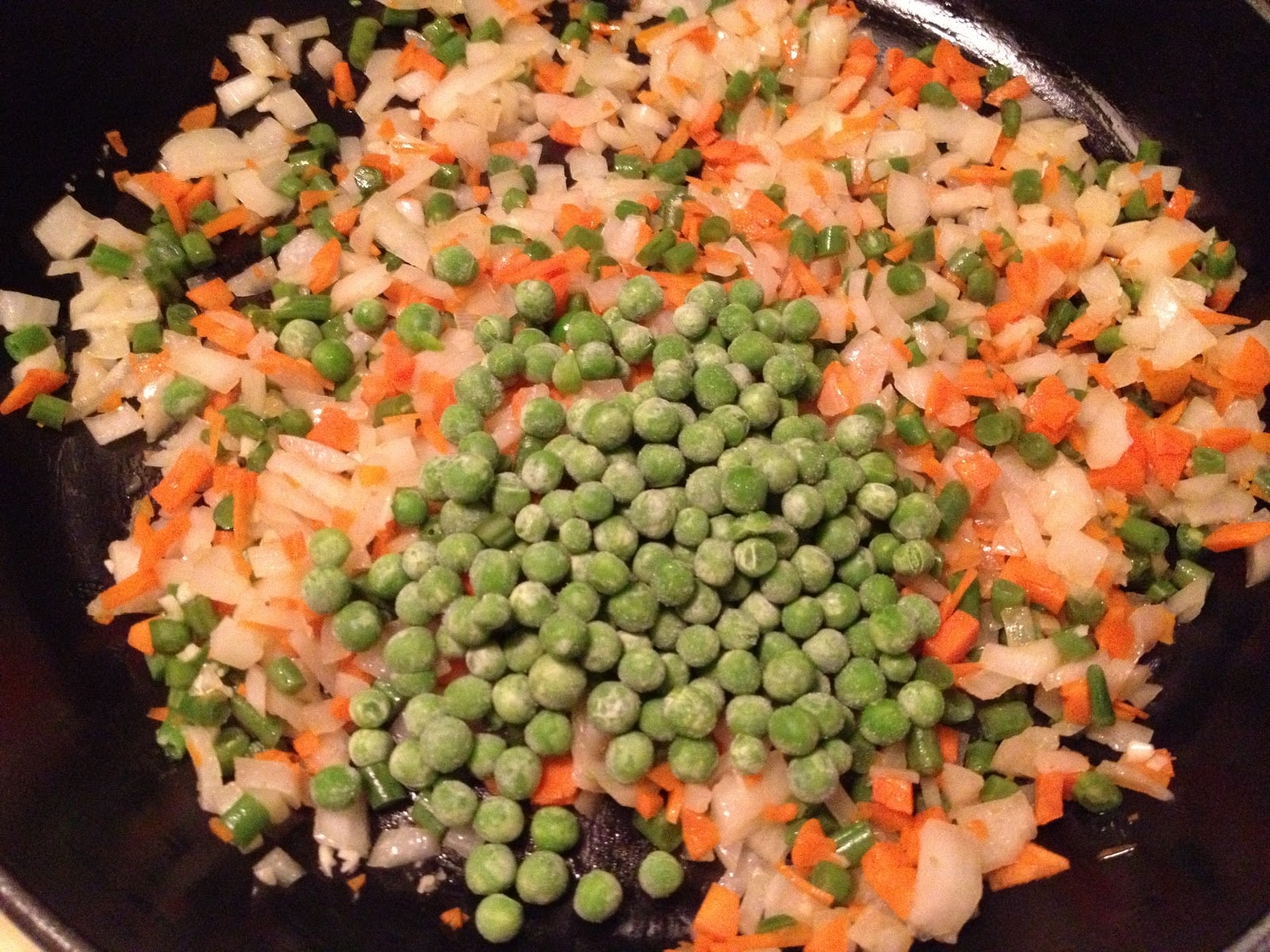 -While your cauliflower is simmering, heat 1 tbsp olive oil in a large cast iron skillet. Add the onions, carrot, green beans and garlic. Sauté for 5 minutes until the vegetables are tender. Add the frozen peas and cook for 1 more minute.