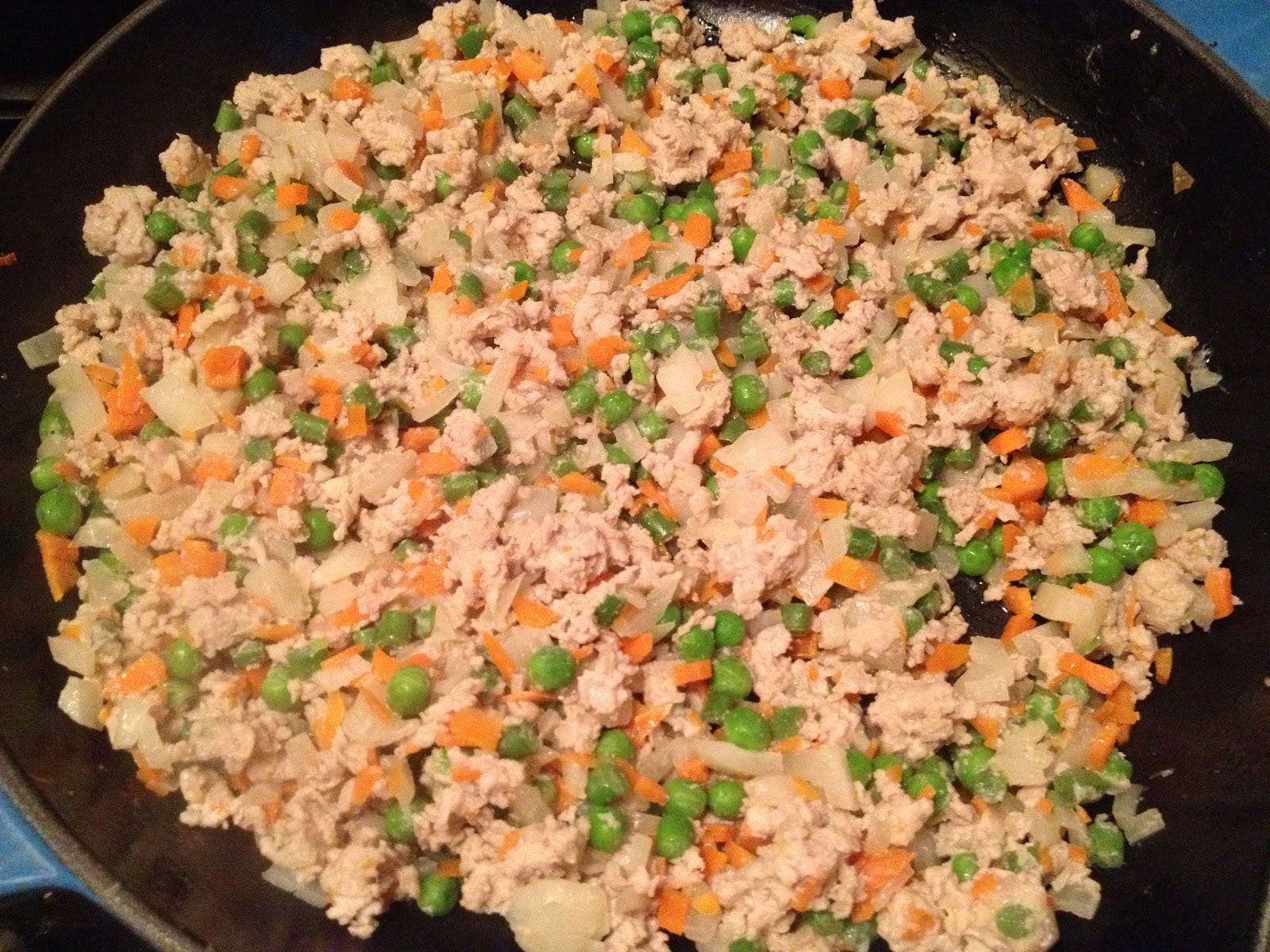 - Add the ground turkey to the vegetables. Cook for about 5 minutes, breaking up the meat with a spatula, until the turkey is no longer pink.