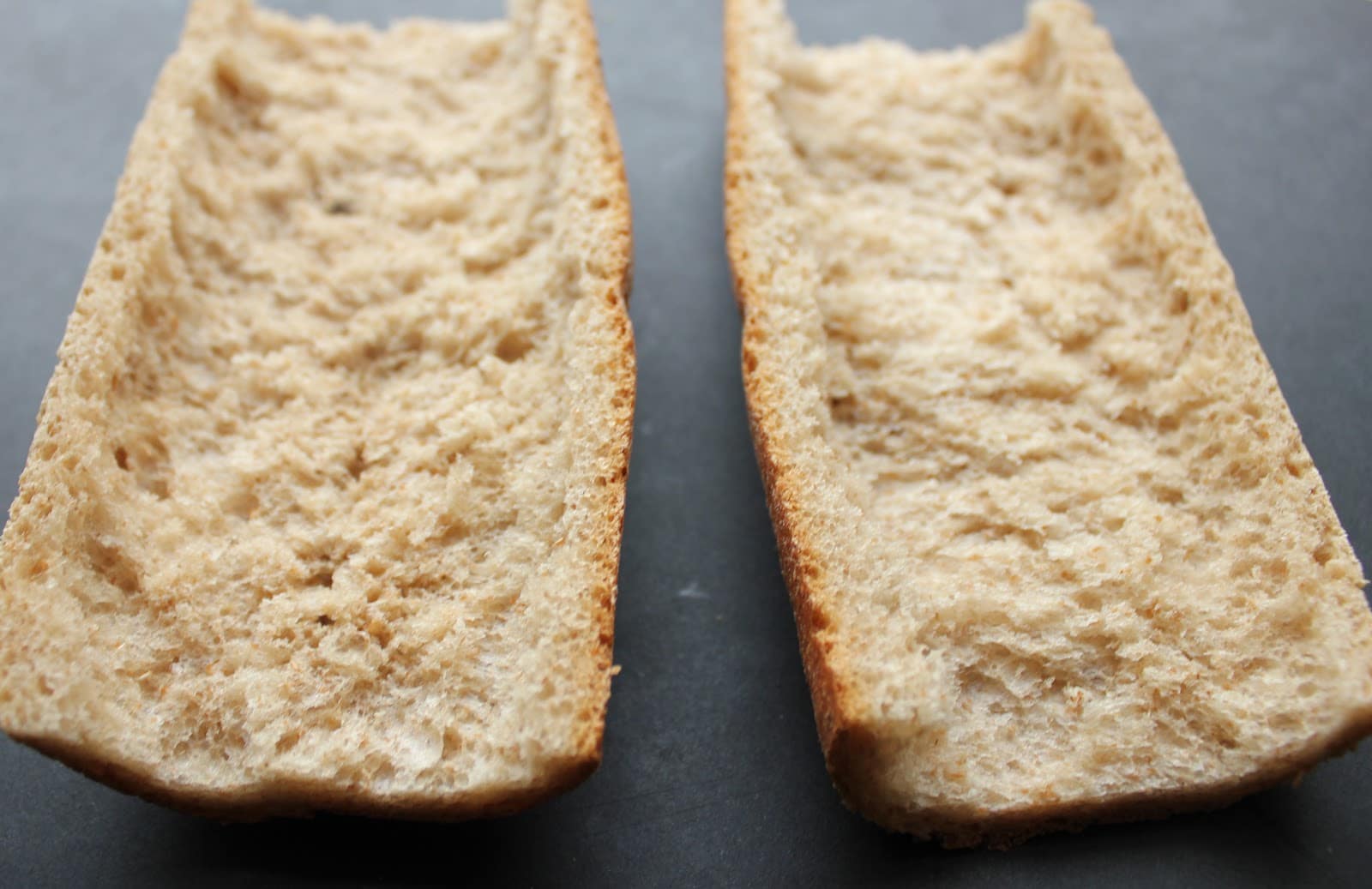 - Slice the sub rolls in half and hollow out the insides. (If you are concerned about wasting the fluffy bread innards, you can save them and use them to make whole grain breadcrumbs later, okay?)