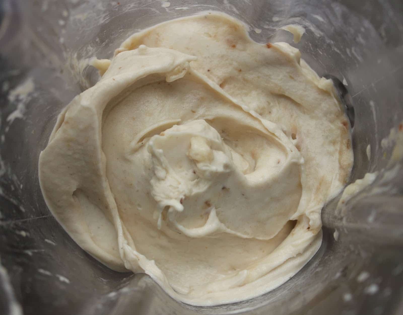-Place your frozen bananas into a blender or food processor and puree. At first the bananas will take on a sort of sandy texture. This is normal, just keep scraping down the sides and pureeing until they take on the smooth texture of soft-serve ice cream. If you cant get your food processor/blender going, add a tiny splash of milk to help things along.